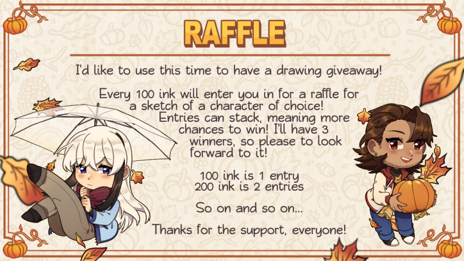 At the end of Inksgiving I'll reach out to winners for their sketch! If I get no response in 2 days I'll draw for another :) Thank you for your ongoing support. Happy holidays