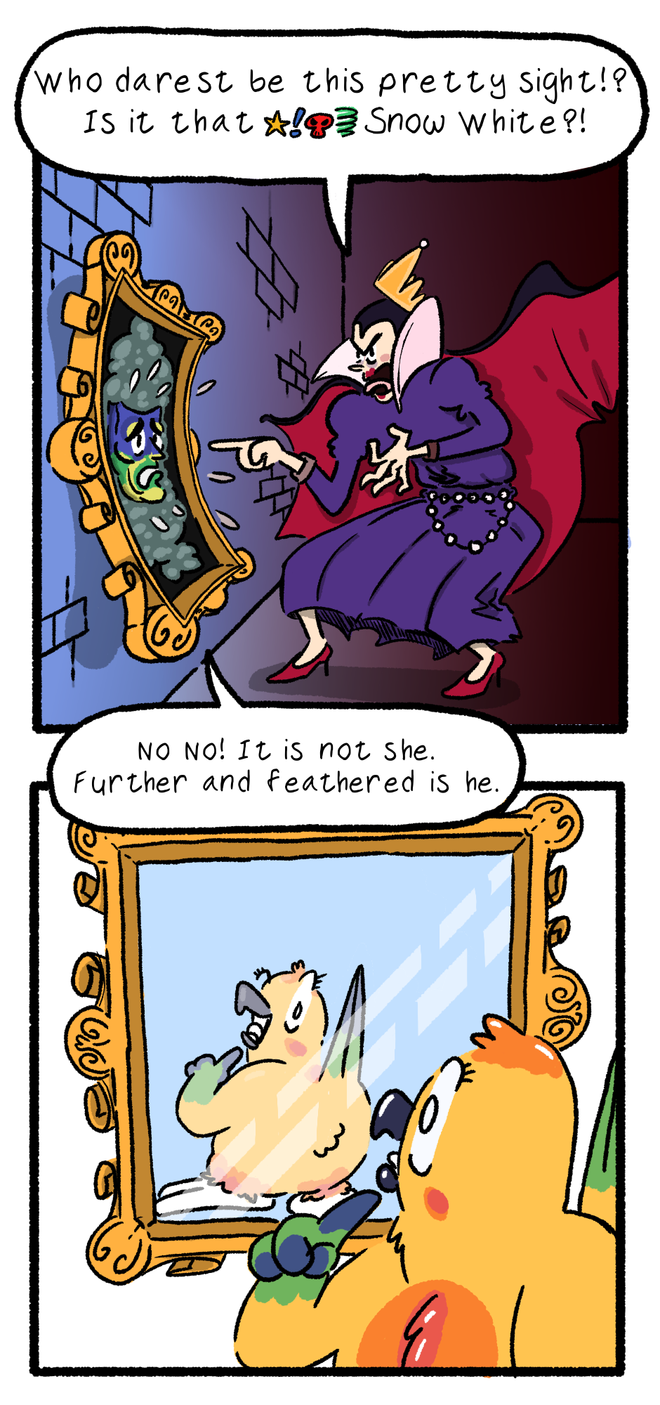 Unseen Panels: Queen takes a magic potion to turn into a bird before being shot by a hunter while flying.