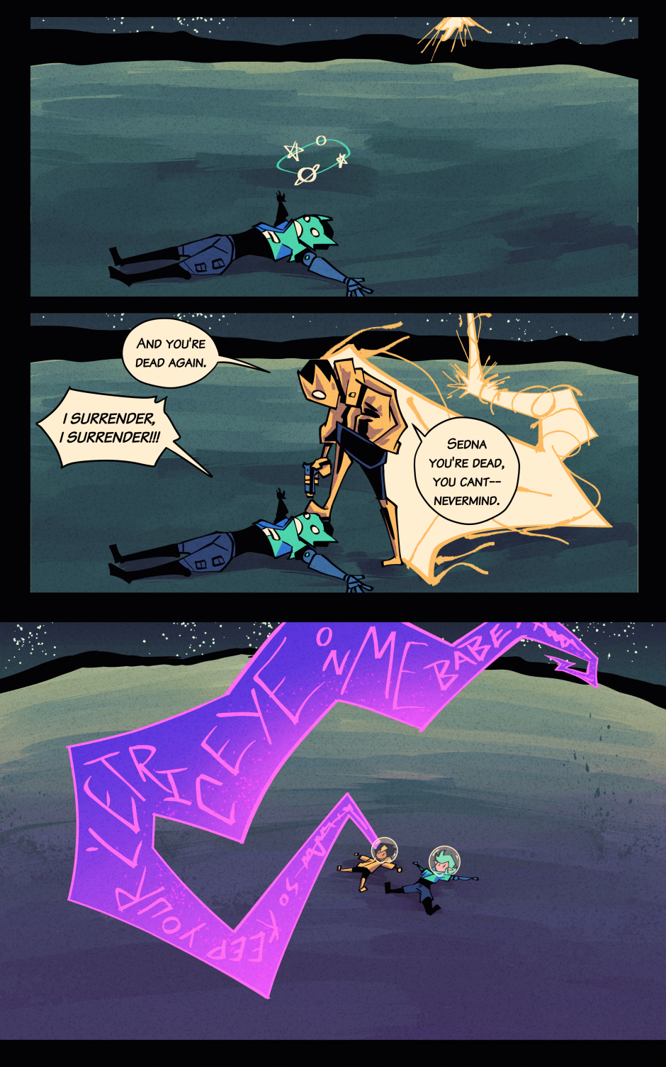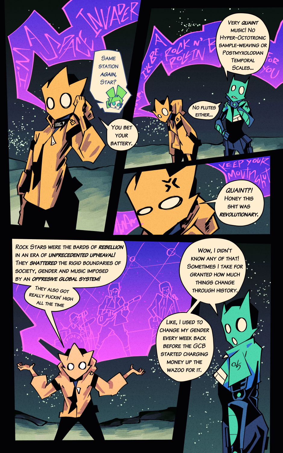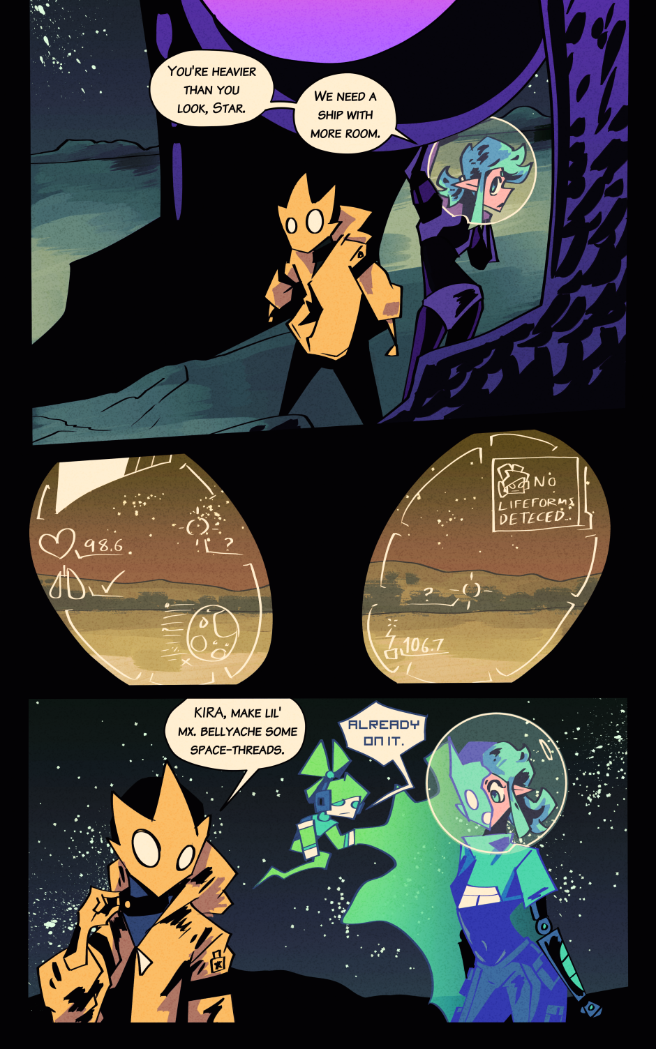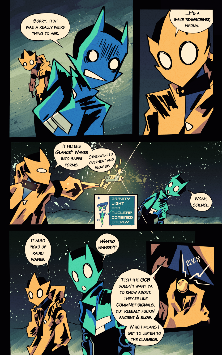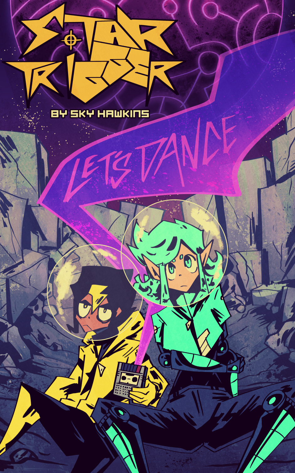 Starman + Solar Raygun = Star-Trigger! Follow the misadventures of this misanthropic man of mystery and misdemeanors, and his simple but sincere spaceship steers-person Sedna, as they live a life on the run from the monopolistic might of the intergalaxy's most intrepid agents of economic authority!