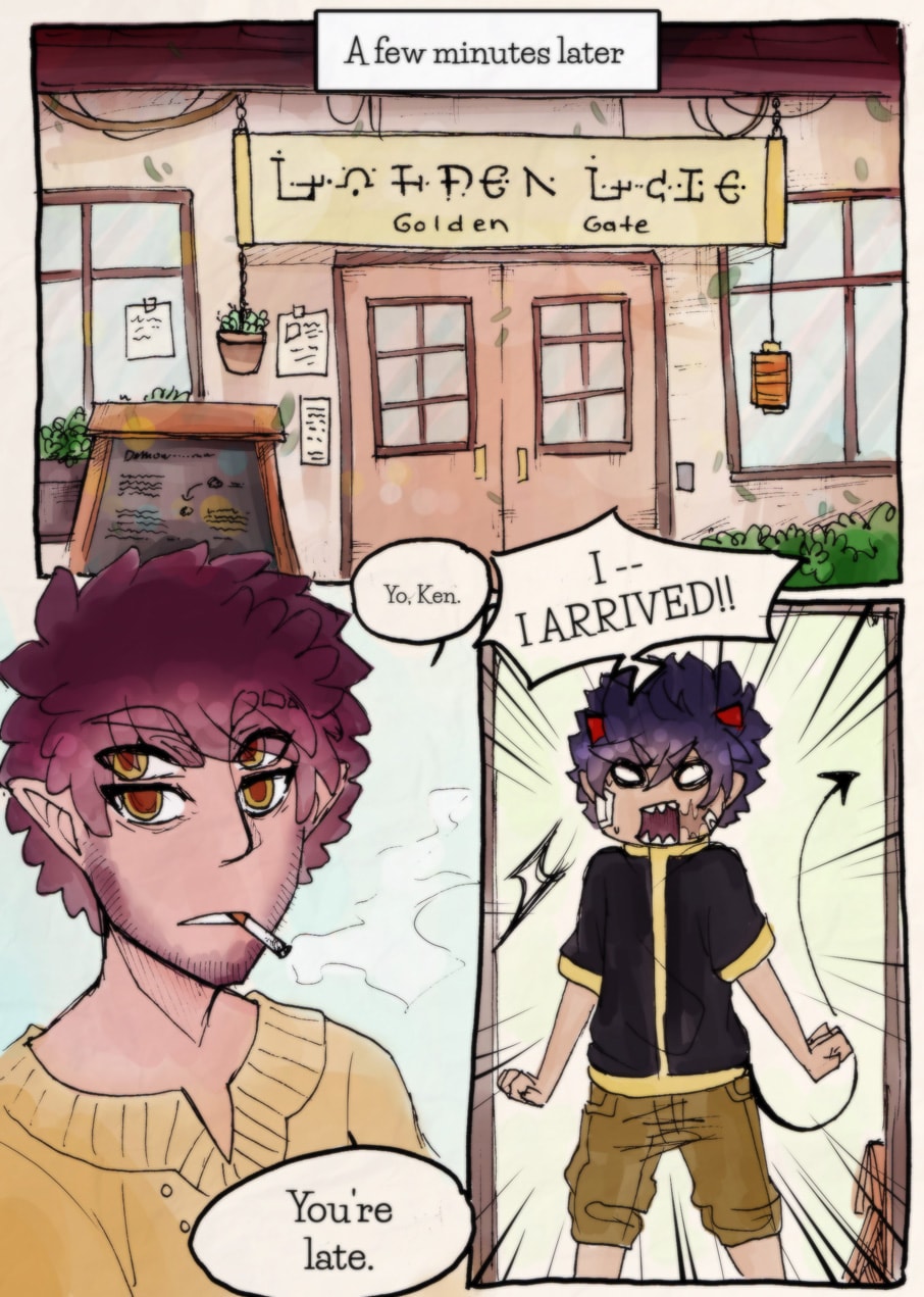 That font for the sign is absolutely amazing @ w @ Good job with it! It's hard to create a unique and yet also legible font, I think ^^ I'd love to see the whole alphabet in that style <3