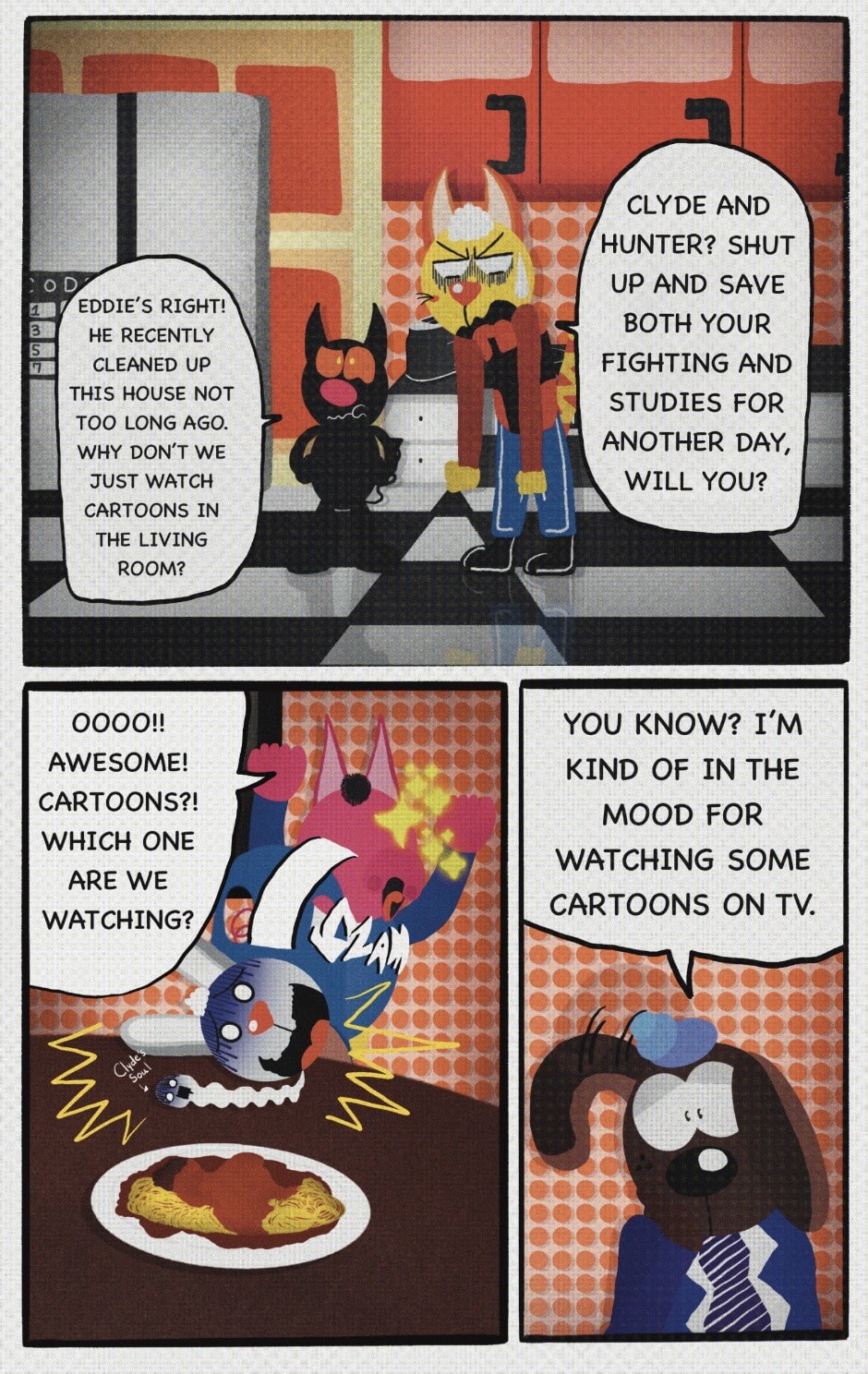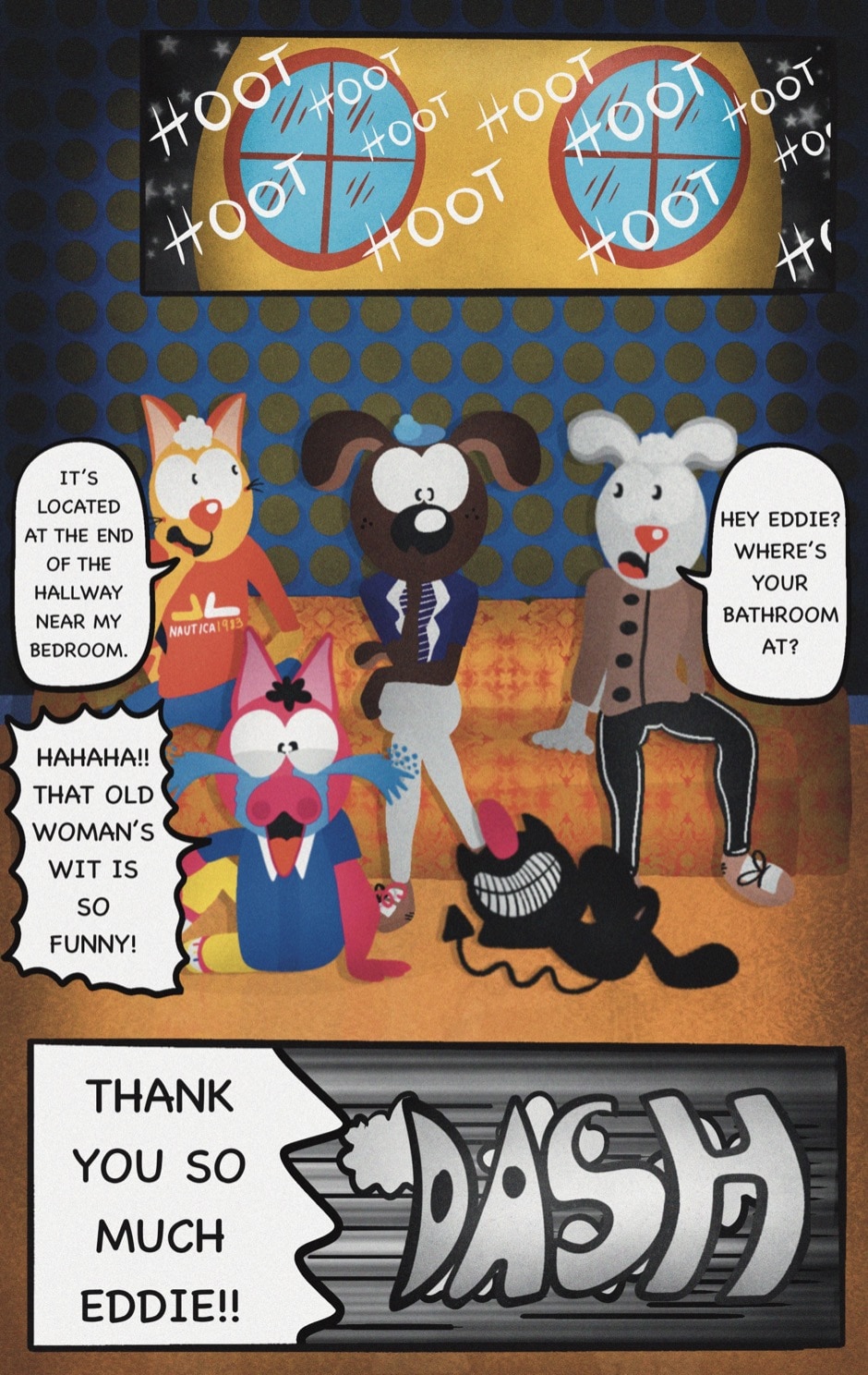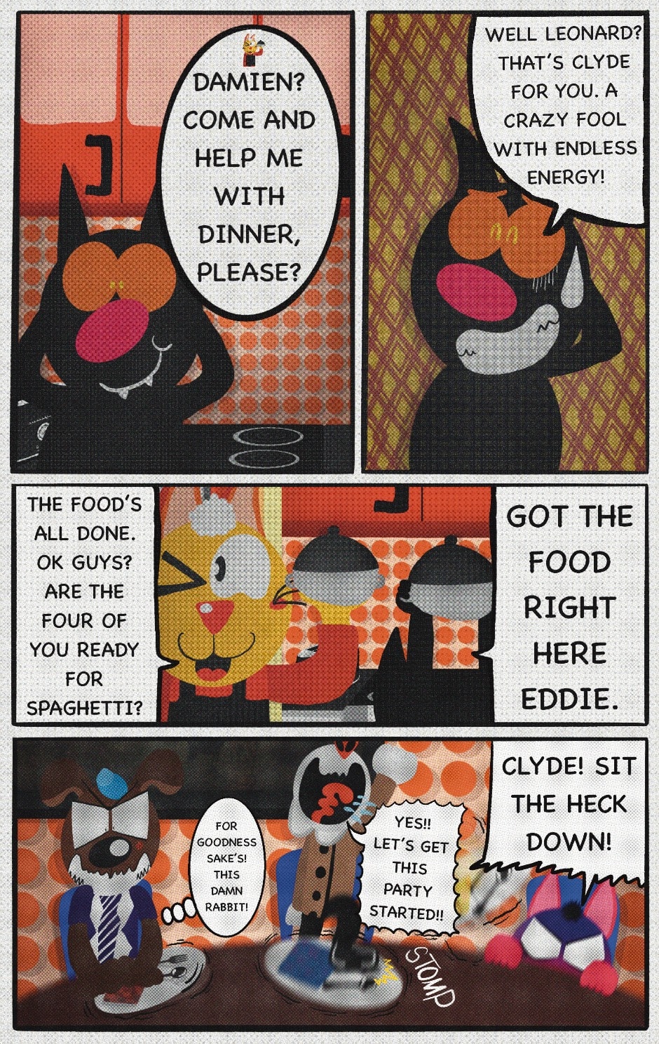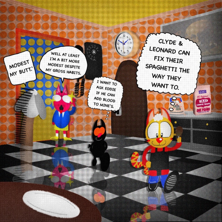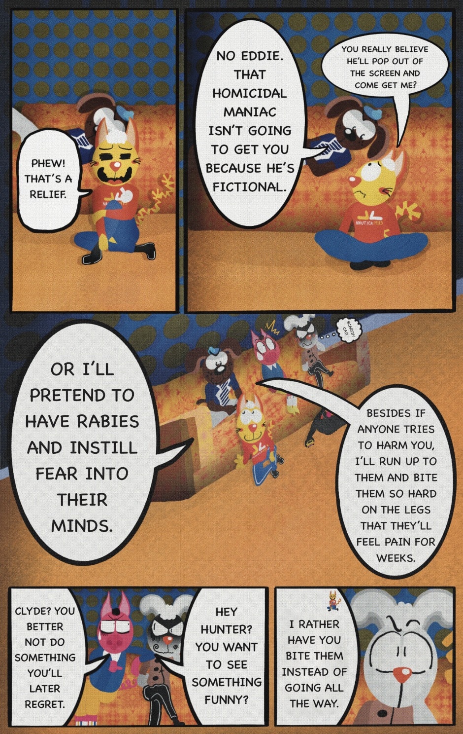 The Cat In Fear, also known as Kyōfu No Neko (恐怖の猫) in Japanese, is a American-Japanese influenced children’s slapstick horror comedy (horredy) manga-inspired comic cartoon aimed at older children (10-12 years of age) that revolves around a group of adults (24-year-old kind-hearted, caring yet cowardly American yellow cat Eddie, 35-year-old grumpy, sarcastic, no-nonsense with a heart of gold Swahili-American brown dog Leonard, 25-year-old brash, arrogant, impulsive French-American rabbit Clyde & 18-year-old studious and intelligent Canadian pig Hunter) who, along with their demon friend from Hell named Damien, reside in the city of High Point, North Carolina where they have to cope with their everyday fears on a regular basis whether it’s mundane or supernatural situations.
