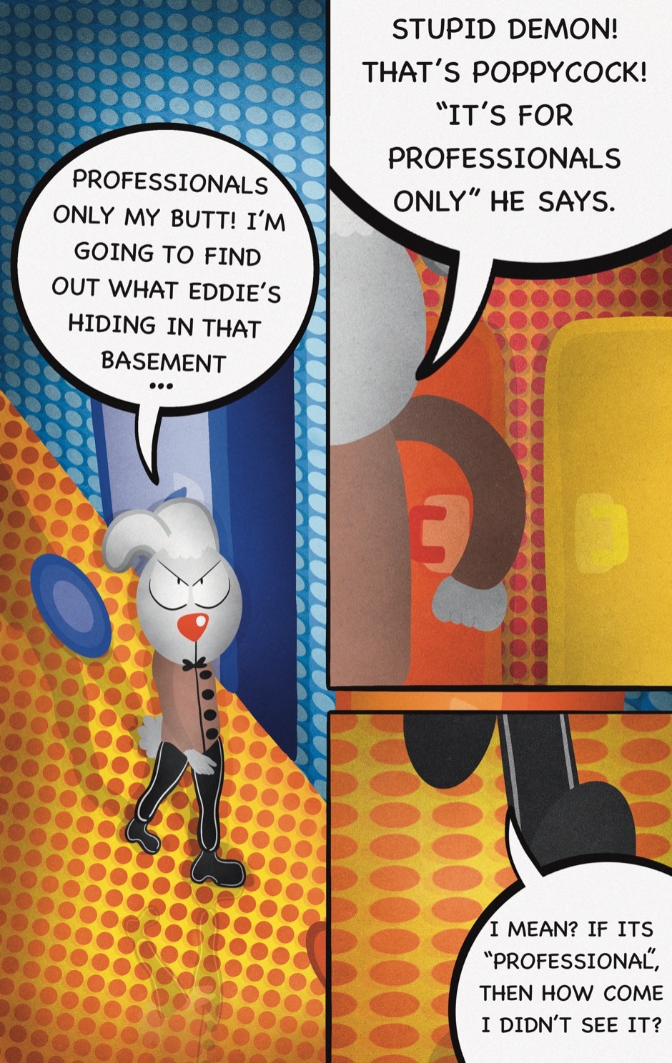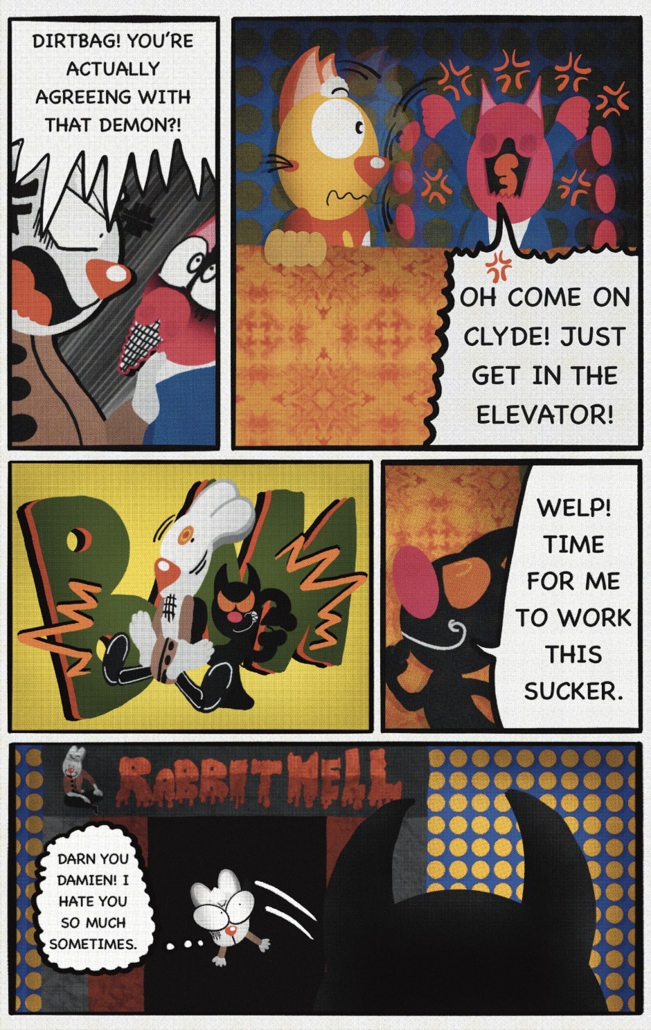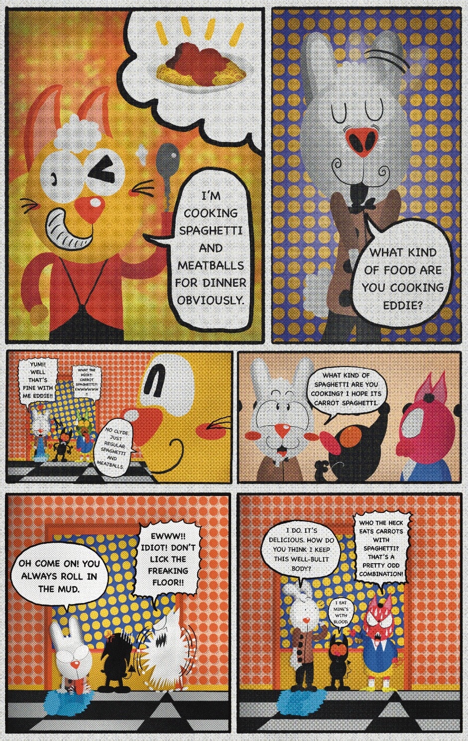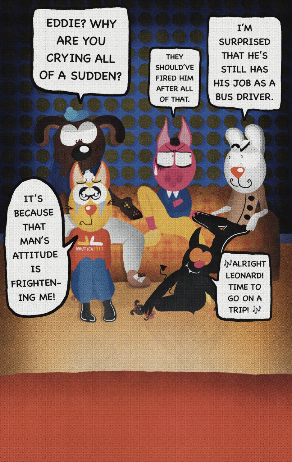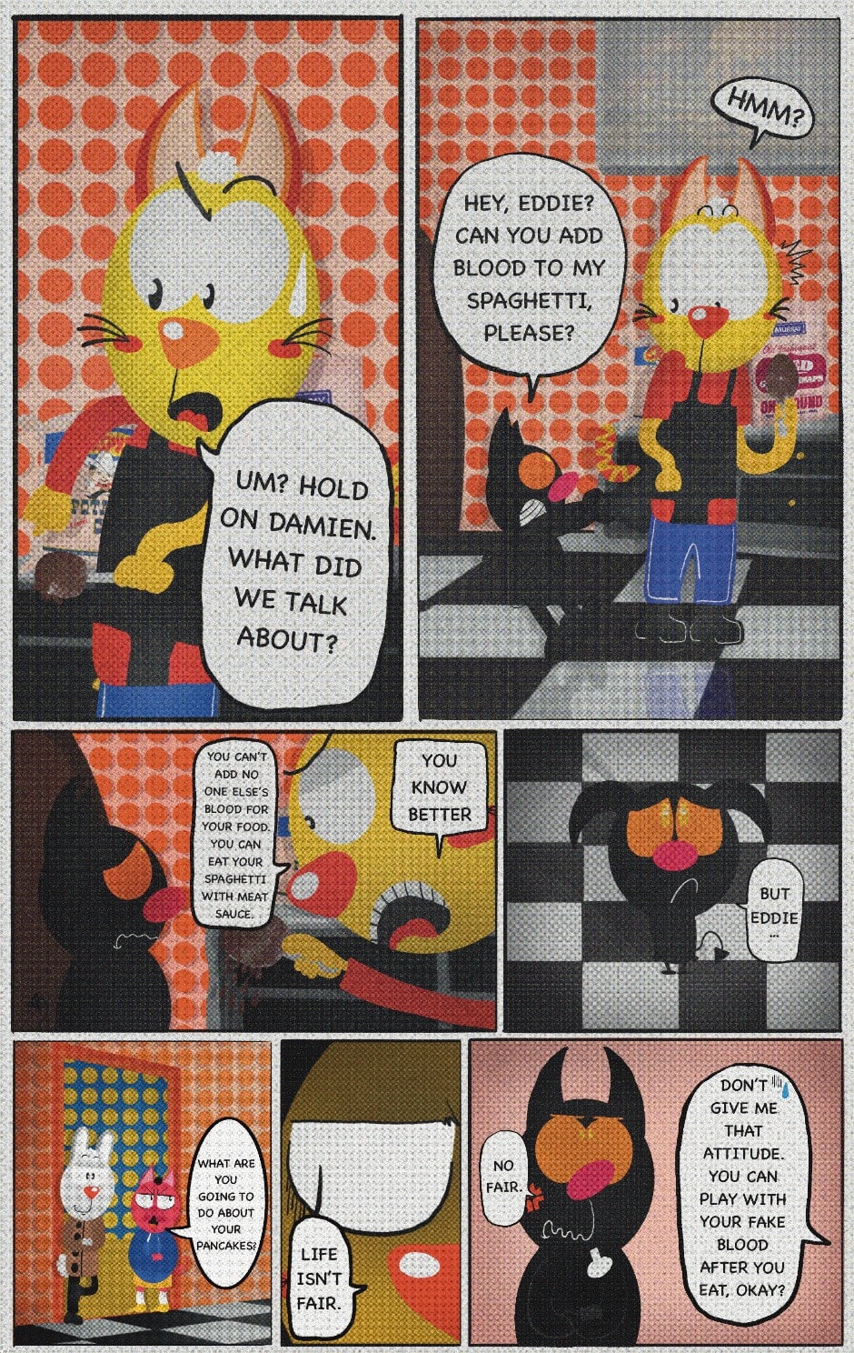 The Cat In Fear, also known as Kyōfu No Neko (恐怖の猫) in Japanese, is a American-Japanese influenced children’s slapstick horror comedy (horredy) manga-inspired comic cartoon aimed at older children (10-12 years of age) that revolves around a group of adults (24-year-old kind-hearted, caring yet cowardly American yellow cat Eddie, 35-year-old grumpy, sarcastic, no-nonsense with a heart of gold Swahili-American brown dog Leonard, 25-year-old brash, arrogant, impulsive French-American rabbit Clyde & 18-year-old studious and intelligent Canadian pig Hunter) who, along with their demon friend from Hell named Damien, reside in the city of High Point, North Carolina where they have to cope with their everyday fears on a regular basis whether it’s mundane or supernatural situations.