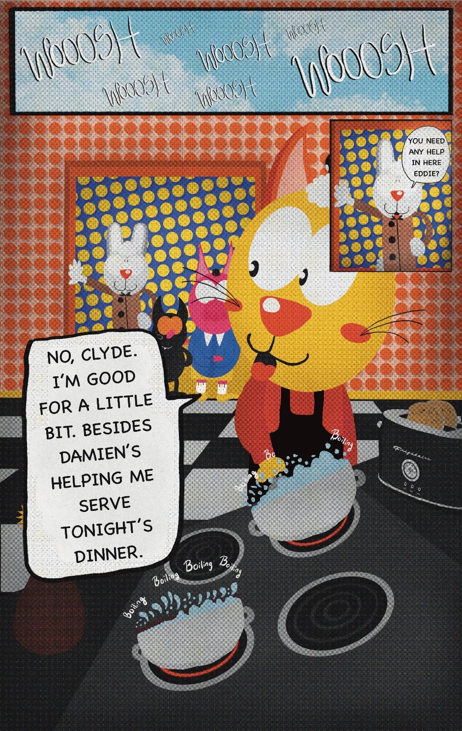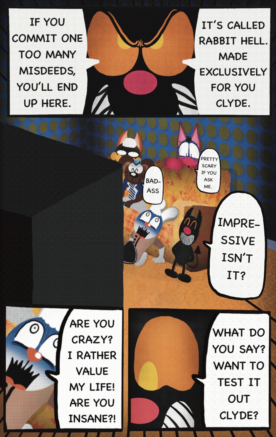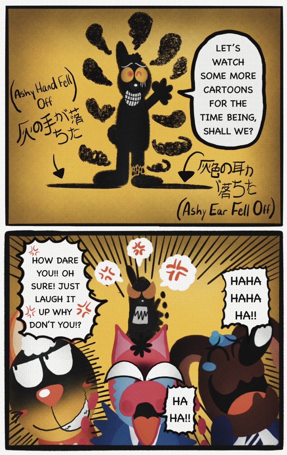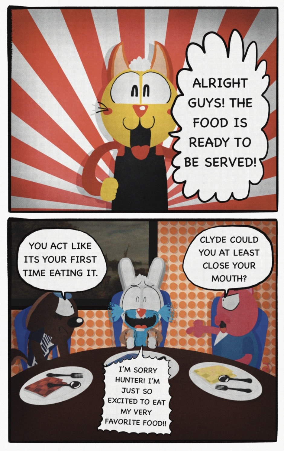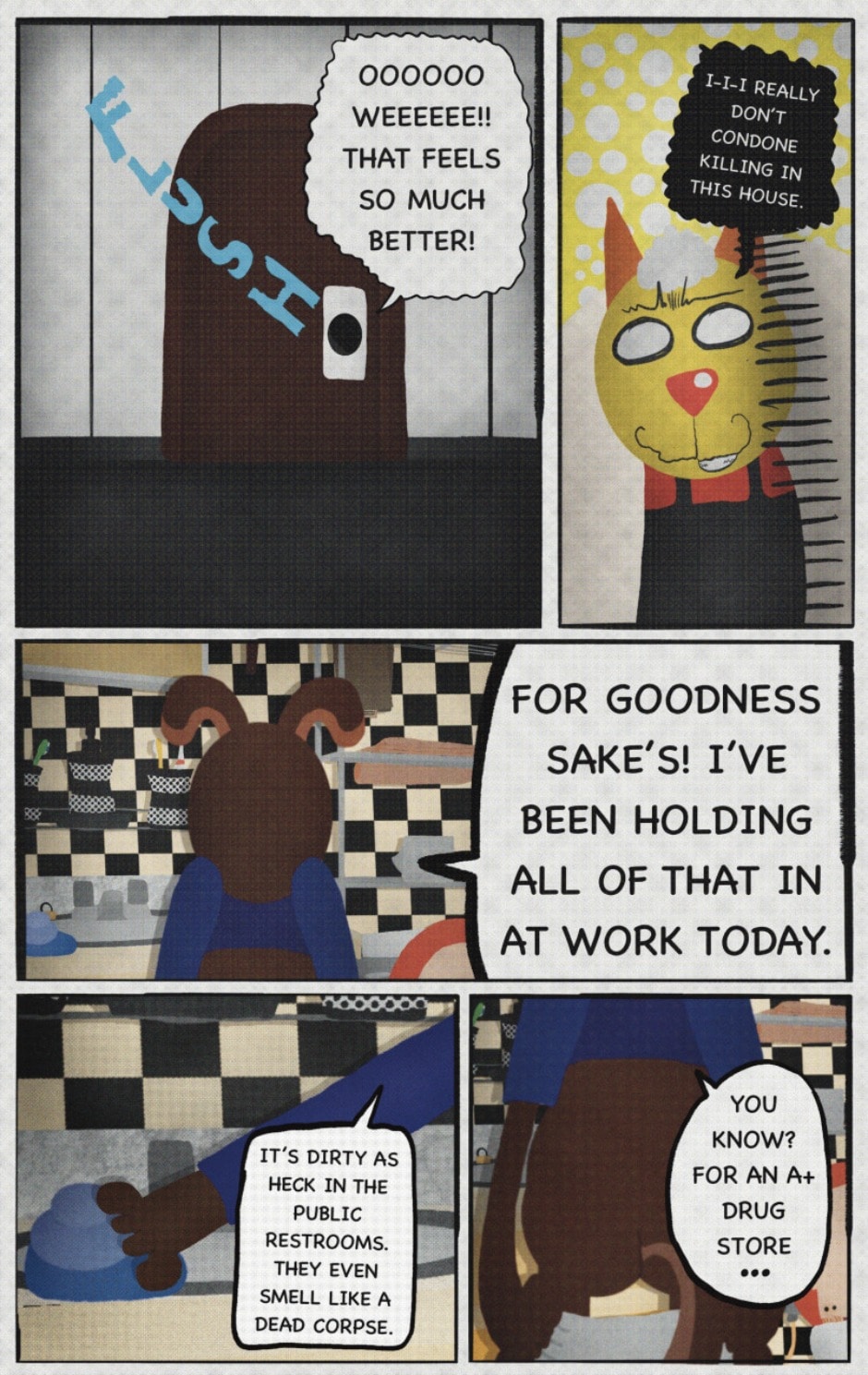 The Cat In Fear, also known as Kyōfu No Neko (恐怖の猫) in Japanese, is a American-Japanese influenced children’s slapstick horror comedy (horredy) manga-inspired comic cartoon aimed at older children (10-12 years of age) that revolves around a group of adults (24-year-old kind-hearted, caring yet cowardly American yellow cat Eddie, 35-year-old grumpy, sarcastic, no-nonsense with a heart of gold Swahili-American brown dog Leonard, 25-year-old brash, arrogant, impulsive French-American rabbit Clyde & 18-year-old studious and intelligent Canadian pig Hunter) who, along with their demon friend from Hell named Damien, reside in the city of High Point, North Carolina where they have to cope with their everyday fears on a regular basis whether it’s mundane or supernatural situations.