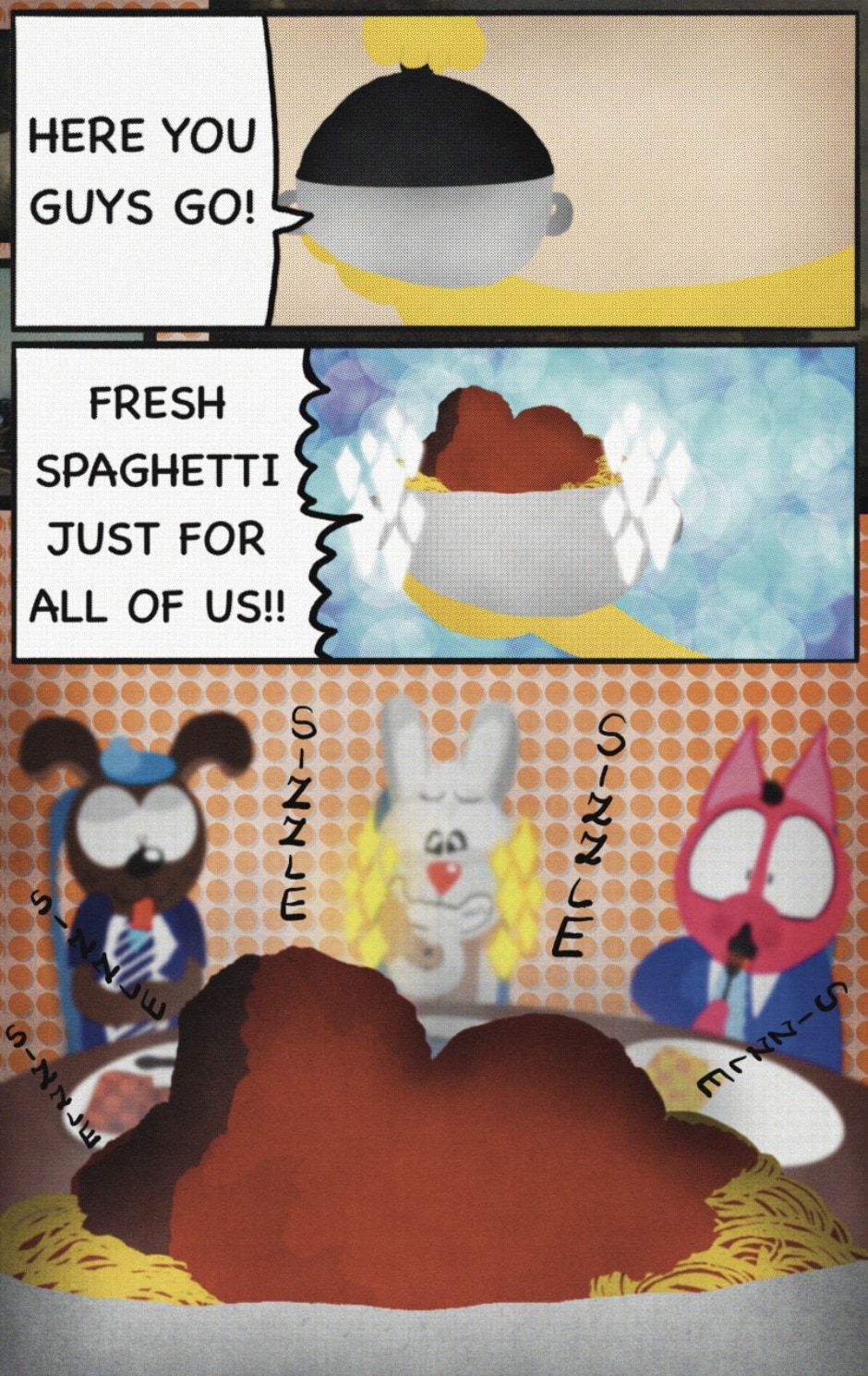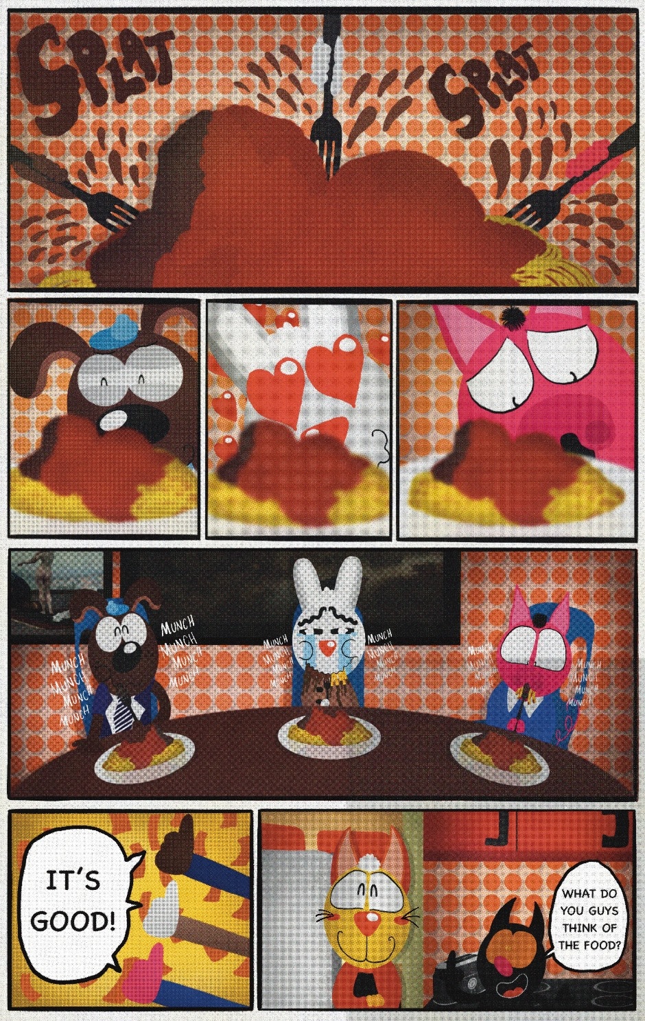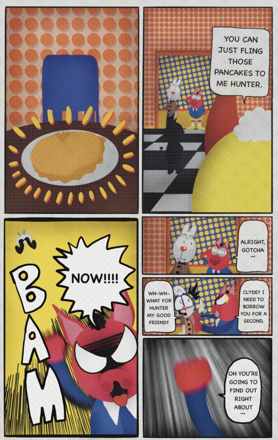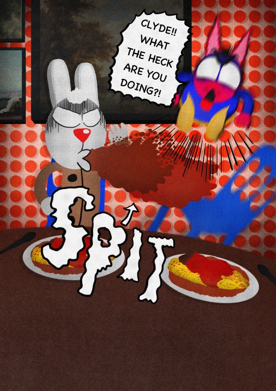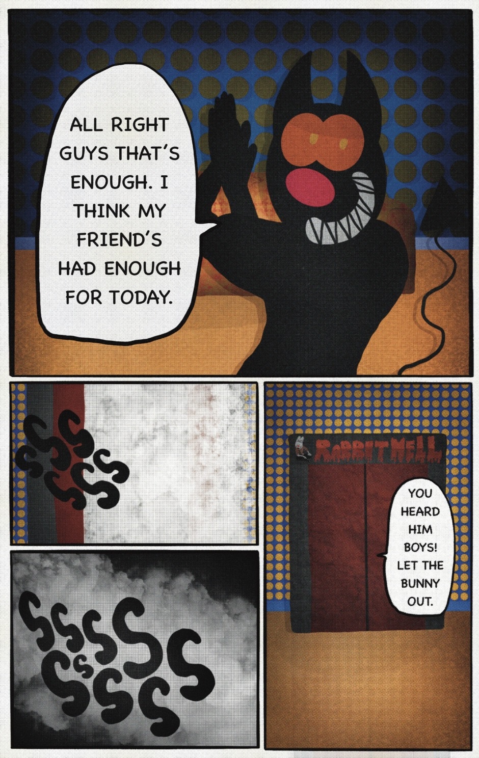 The Cat In Fear, also known as Kyōfu No Neko (恐怖の猫) in Japanese, is a American-Japanese influenced children’s slapstick horror comedy (horredy) manga-inspired comic cartoon aimed at older children (10-12 years of age) that revolves around a group of adults (24-year-old kind-hearted, caring yet cowardly American yellow cat Eddie, 35-year-old grumpy, sarcastic, no-nonsense with a heart of gold Swahili-American brown dog Leonard, 25-year-old brash, arrogant, impulsive French-American rabbit Clyde & 18-year-old studious and intelligent Canadian pig Hunter) who, along with their demon friend from Hell named Damien, reside in the city of High Point, North Carolina where they have to cope with their everyday fears on a regular basis whether it’s mundane or supernatural situations.