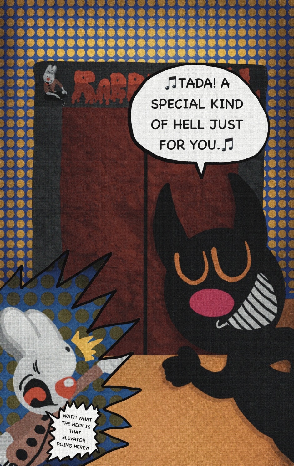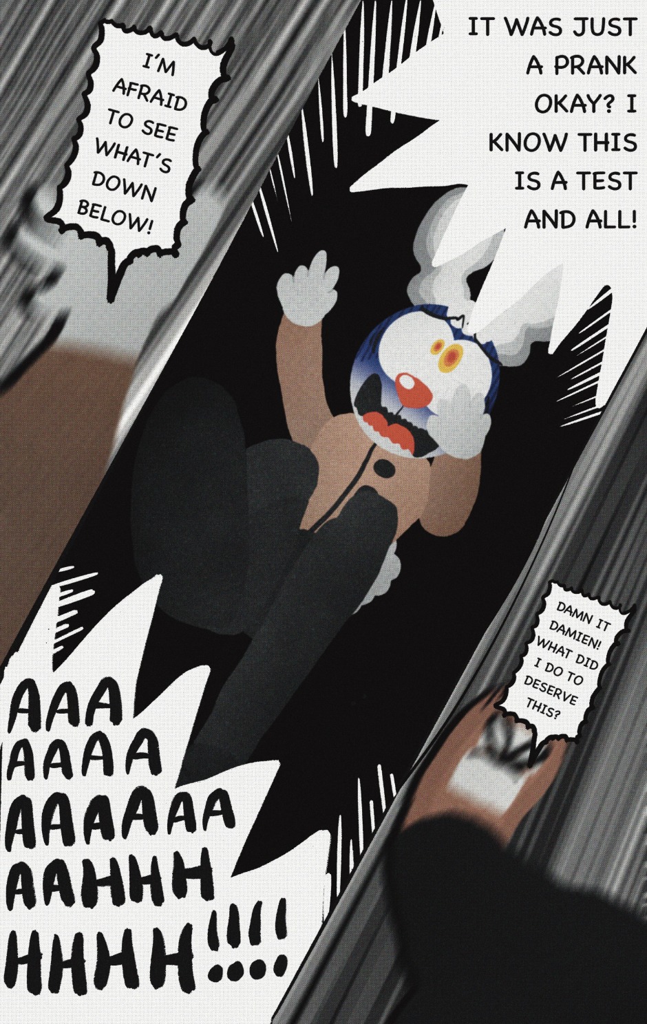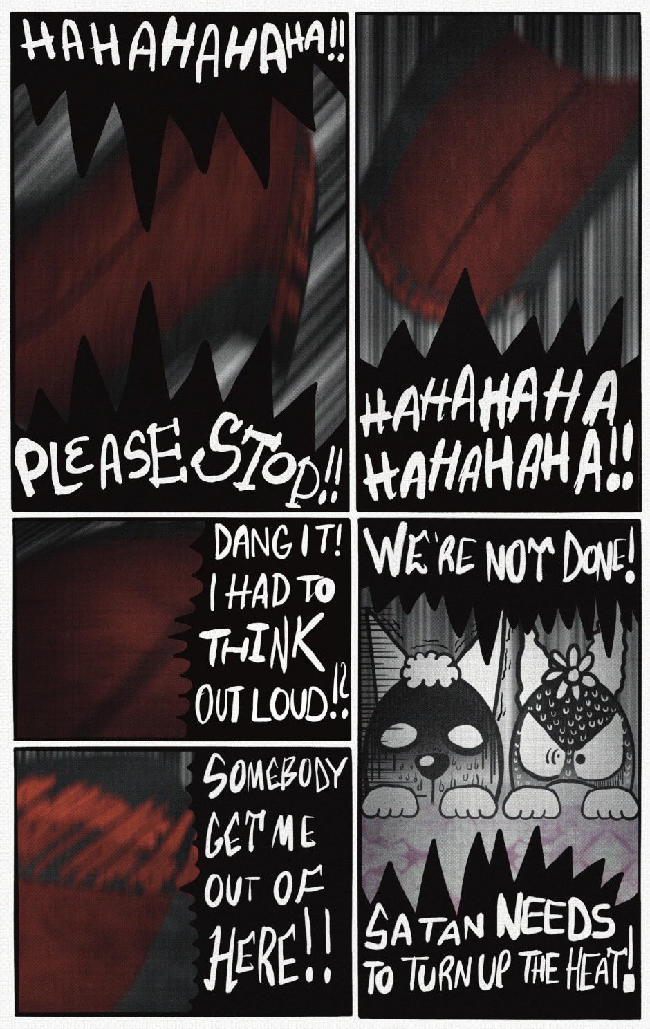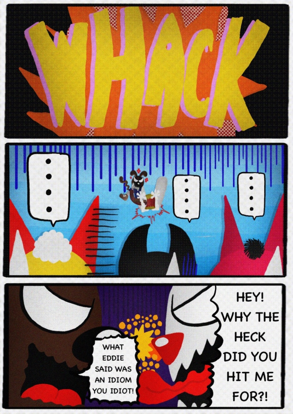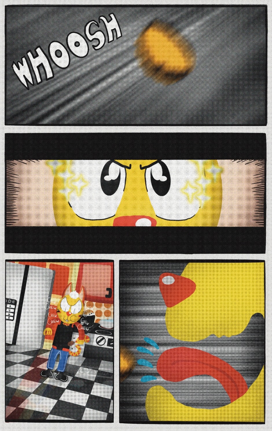 The Cat In Fear, also known as Kyōfu No Neko (恐怖の猫) in Japanese, is a American-Japanese influenced children’s slapstick horror comedy (horredy) manga-inspired comic cartoon aimed at older children (10-12 years of age) that revolves around a group of adults (24-year-old kind-hearted, caring yet cowardly American yellow cat Eddie, 35-year-old grumpy, sarcastic, no-nonsense with a heart of gold Swahili-American brown dog Leonard, 25-year-old brash, arrogant, impulsive French-American rabbit Clyde & 18-year-old studious and intelligent Canadian pig Hunter) who, along with their demon friend from Hell named Damien, reside in the city of High Point, North Carolina where they have to cope with their everyday fears on a regular basis whether it’s mundane or supernatural situations.