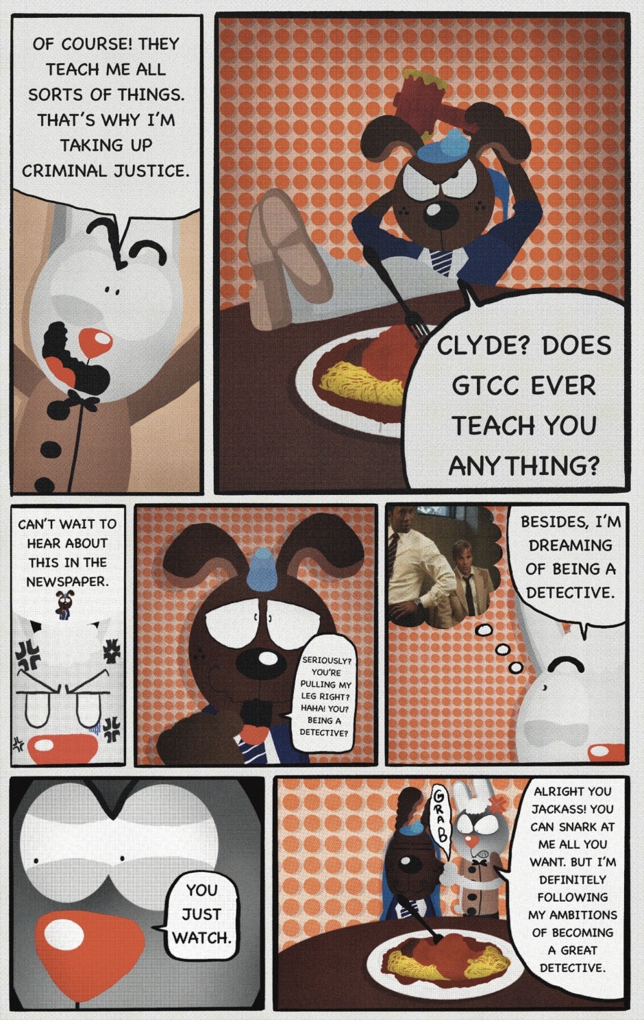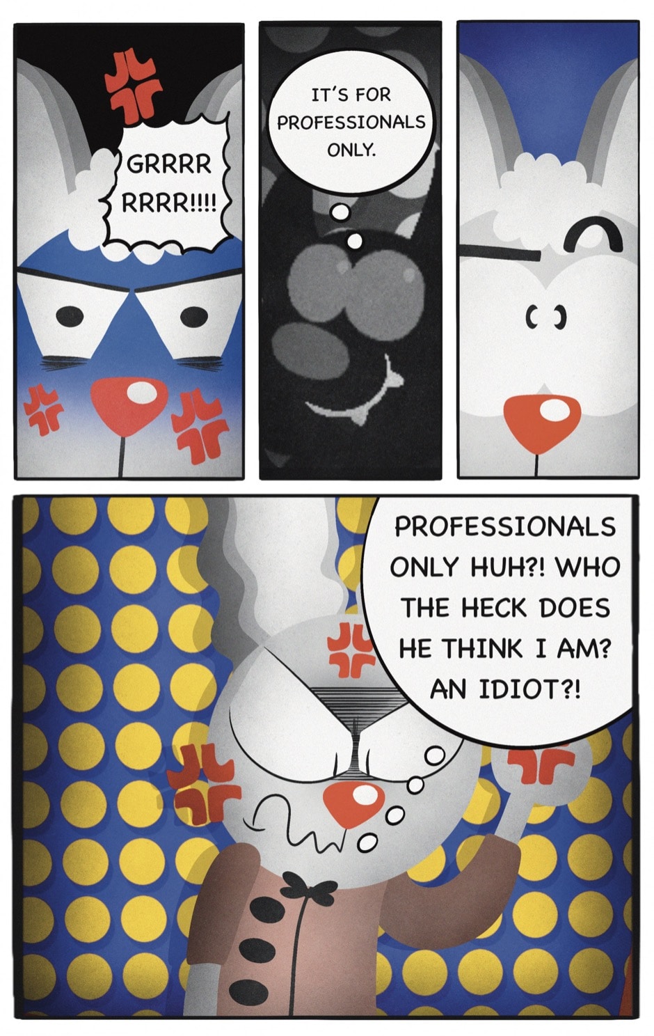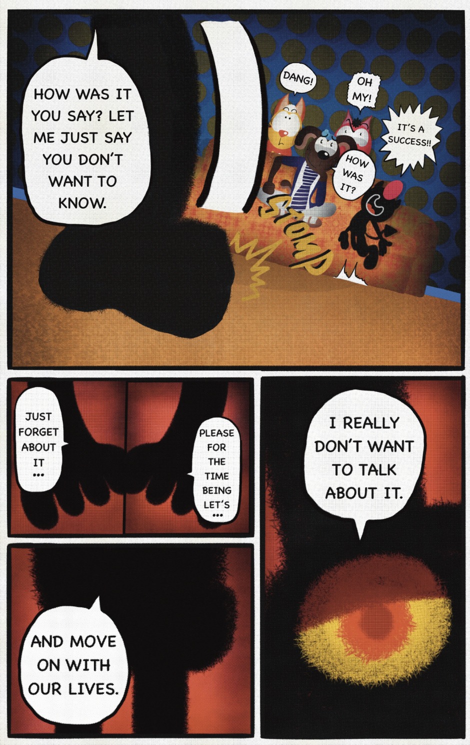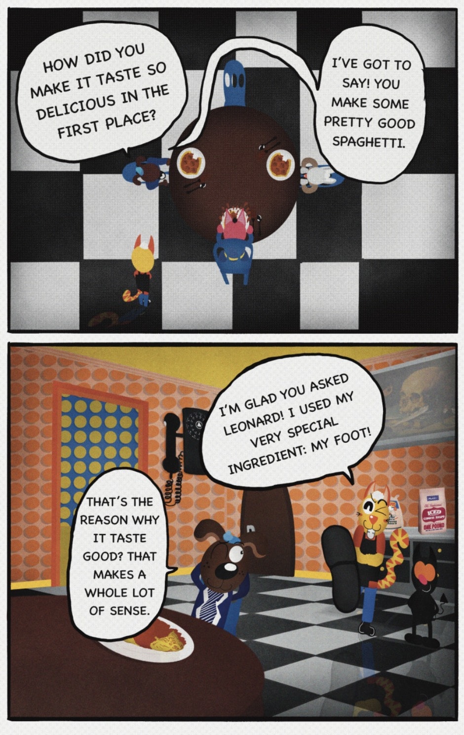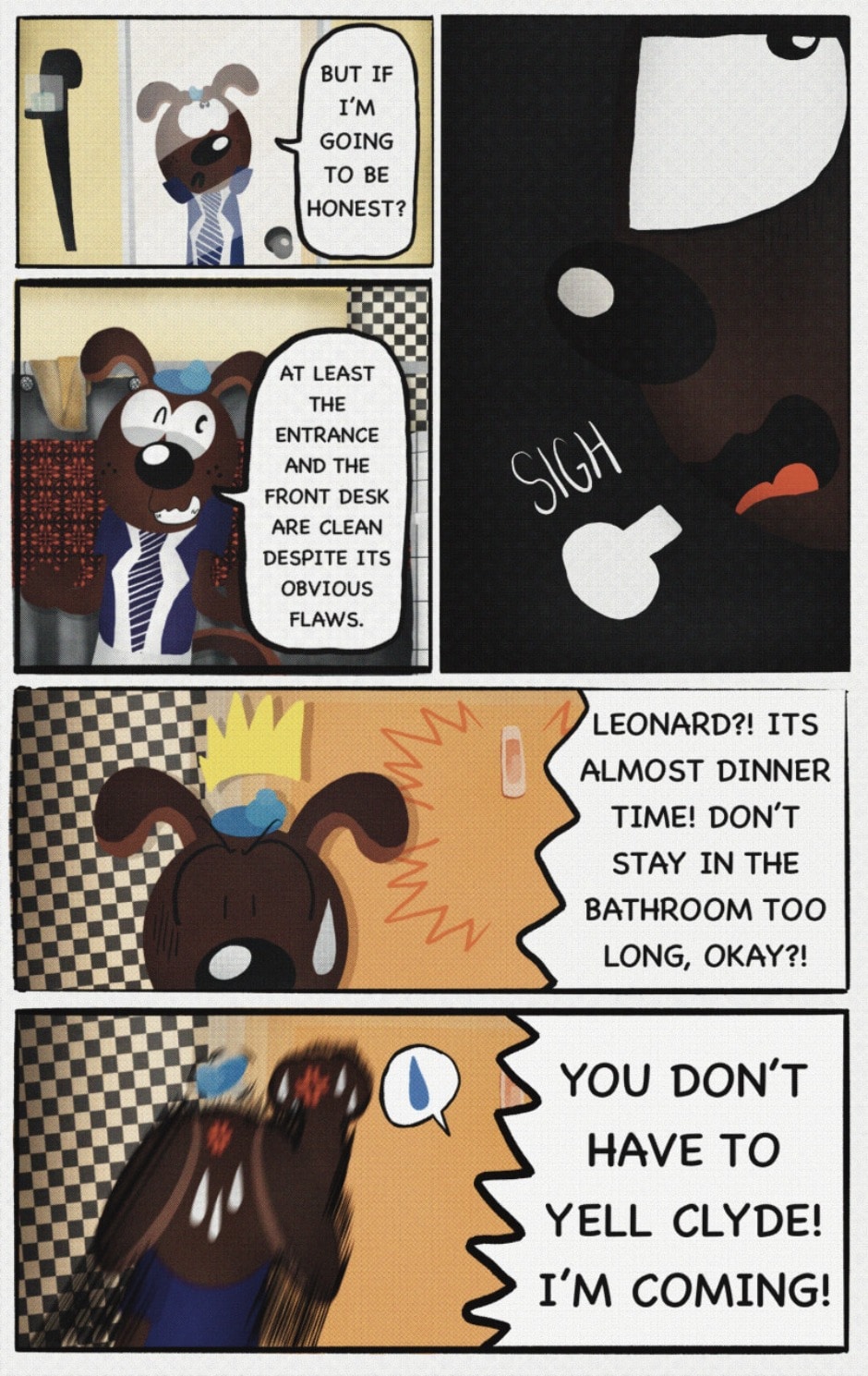 The Cat In Fear, also known as Kyōfu No Neko (恐怖の猫) in Japanese, is a American-Japanese influenced children’s slapstick horror comedy (horredy) manga-inspired comic cartoon aimed at older children (10-12 years of age) that revolves around a group of adults (24-year-old kind-hearted, caring yet cowardly American yellow cat Eddie, 35-year-old grumpy, sarcastic, no-nonsense with a heart of gold Swahili-American brown dog Leonard, 25-year-old brash, arrogant, impulsive French-American rabbit Clyde & 18-year-old studious and intelligent Canadian pig Hunter) who, along with their demon friend from Hell named Damien, reside in the city of High Point, North Carolina where they have to cope with their everyday fears on a regular basis whether it’s mundane or supernatural situations.