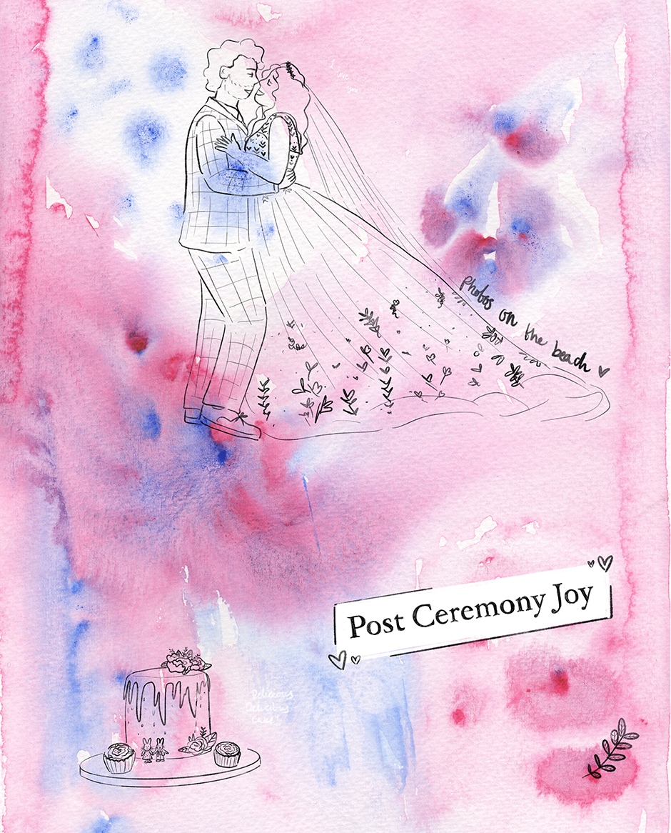 Entry 10; Post Ceremony Joy! We were officially wed, fresh flowers and champagne to hand, best man to carry my train to our beach photography locations, lots of food to be served and the best cake to try, new rings on fingers, and to top it off all of our family and friends surrounding us. It was joyous! - Mia