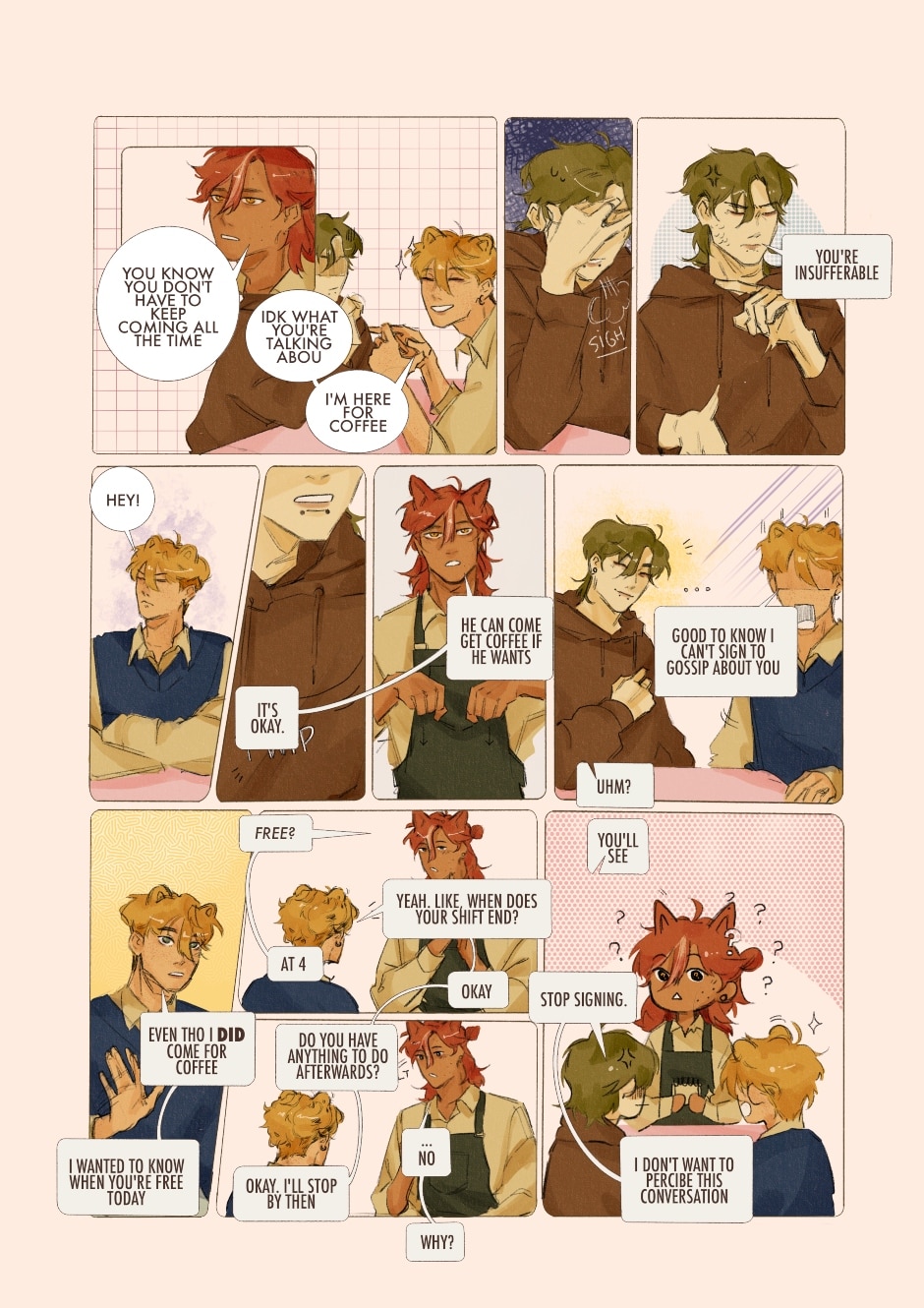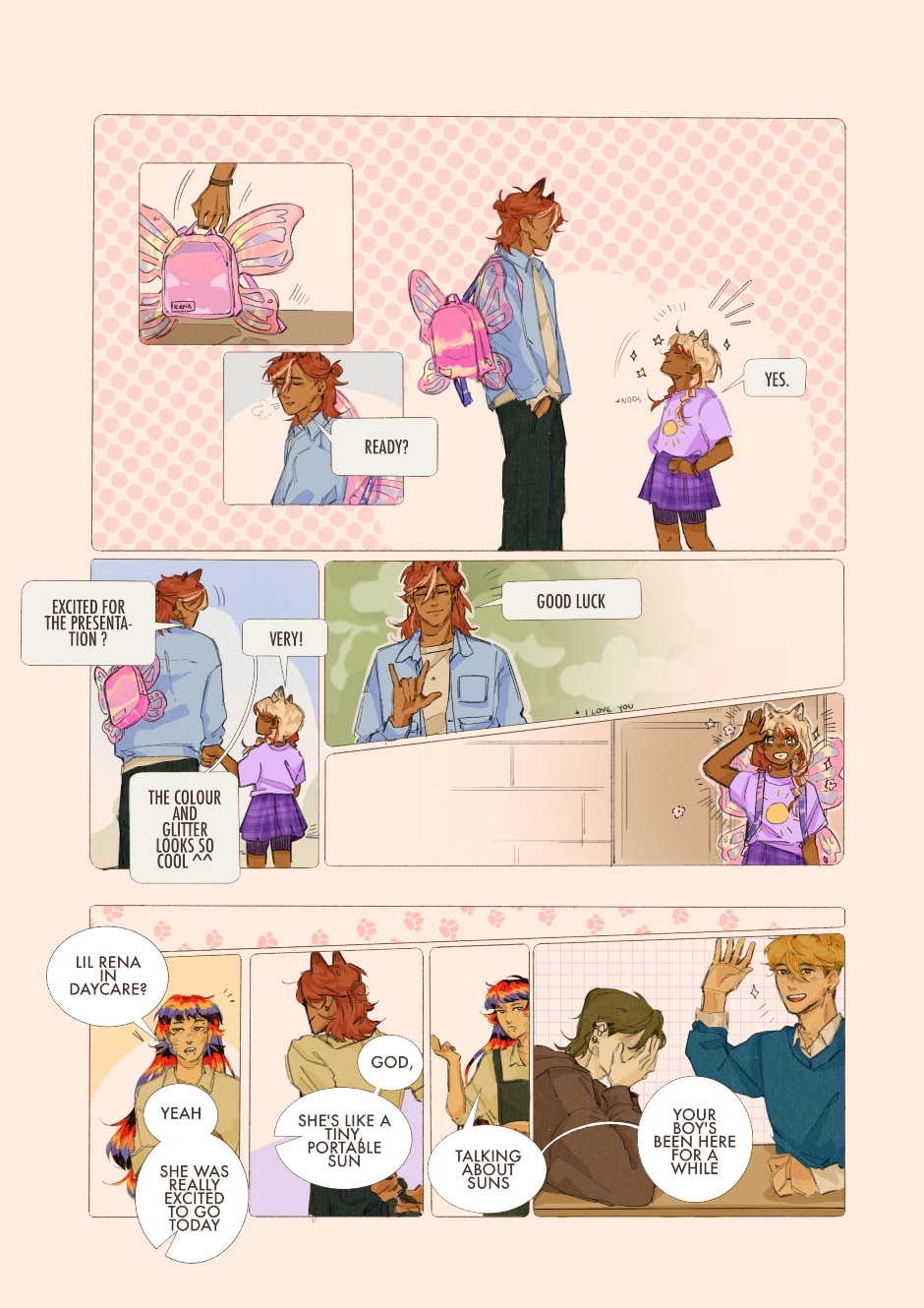 HI ^^ sorry for the wait but life's been really difficult this close to the holidays!! as an apology, look at rena 😭💓 she's finally here and she's tiny <3 small note: i think it's obvious but just in case, the square w rounded edges bubbles are there to signify sign language–rena is deaf while nyoka uses a hearing aid. we based the signing on ASL