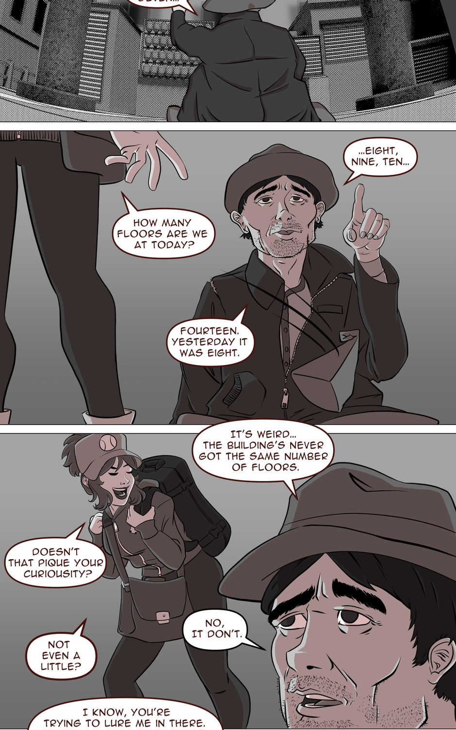 One's for her Hiro, a man counting the number of floors of a mysterious building situated near a mysterious park where a bunch of yokai (unbeknownst to him) hang out.