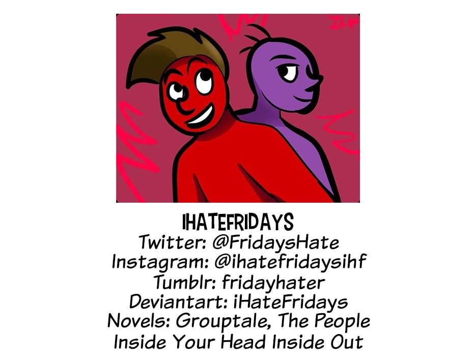 Before the 100th episode, how about some more fan art! iHateFridays' Novels: https://tapas.io/series/Grouptale-Undertale-AU https://tapas.io/series/The-People-Inside-Your-Head-Inside-Out Paige Walshe's Comics: https://tapas.io/series/Froggy https://tapas.io/series/Abby https://tapas.io/series/The-Woods3 Deglis Jerez's Comic: https://www.webtoons.com/es/challenge/hellstaff/list?title_no=670522 Lonker the Creator's Comics: https://tapas.io/series/SWIM-ON https://tapas.io/series/Snarf-kais-Chronicles- https://tapas.io/series/THE-LAST-ELF-
