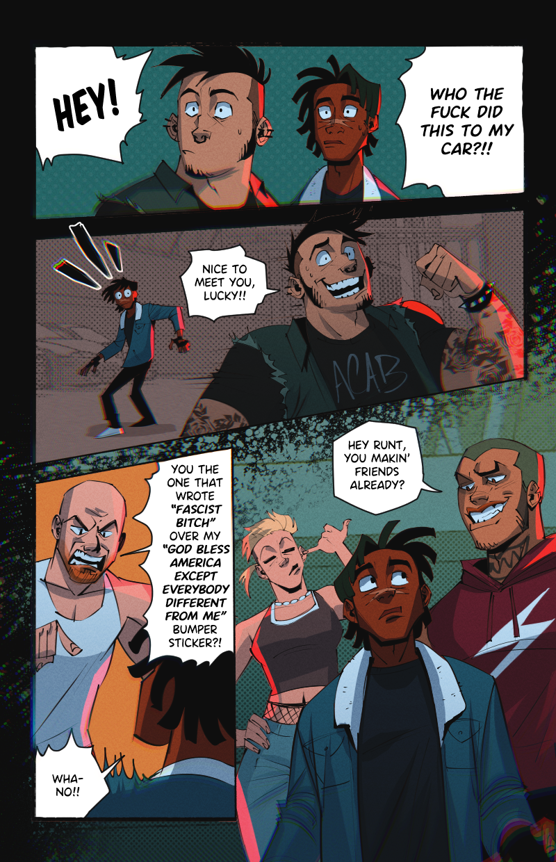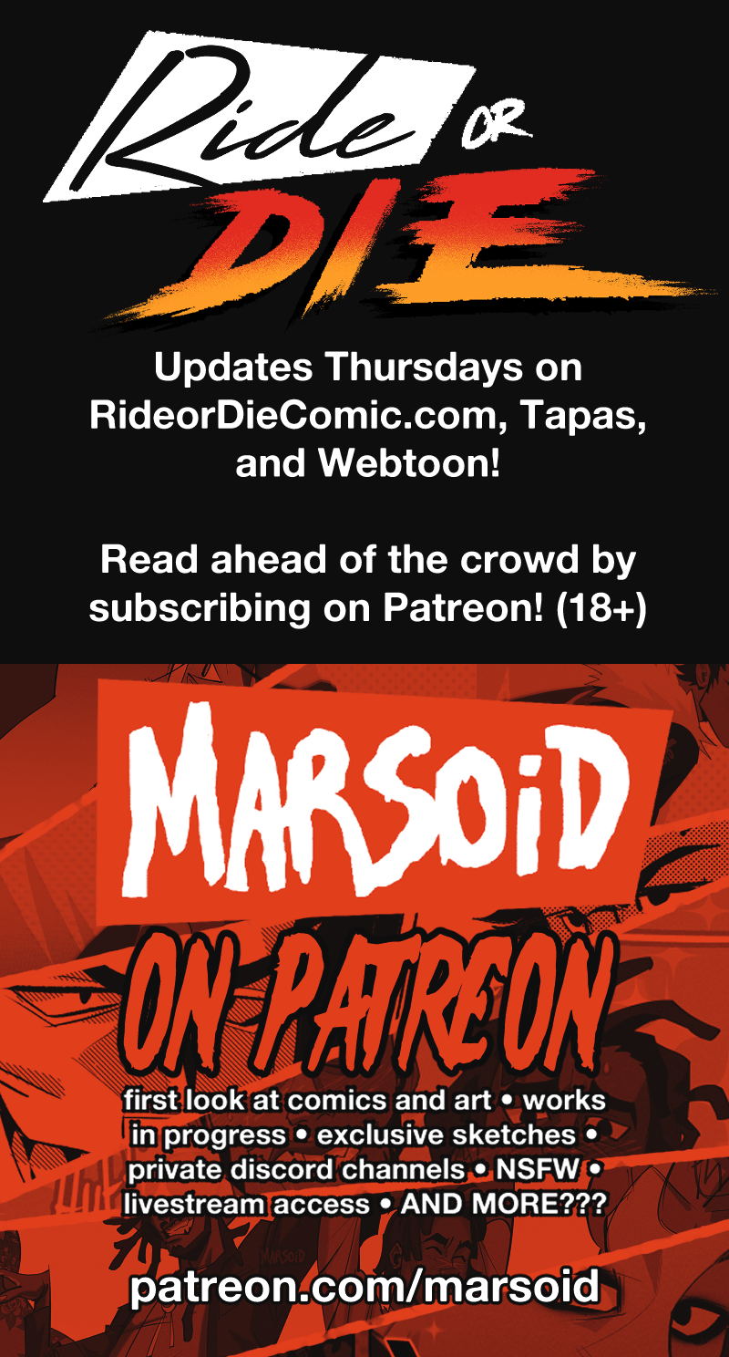 Ride or Die is an LGBTQ webcomic about two street racers who team up with a demon-possessed muscle car in the search for a missing woman, while being hunted by a deadly religious cult.