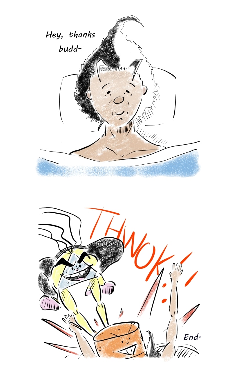 A college student(Jakusha) is tormented by an erratic cartoon character(along with his shape-shifting baseball bat) who have come to life, in various zany ways.