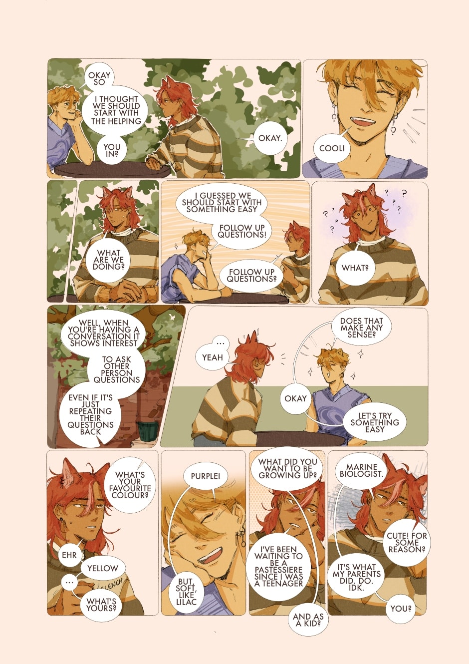 alo! the dialogue in this chapter is giving me a headache but just: the highest bubble you see on a panel is the first one you should read!
