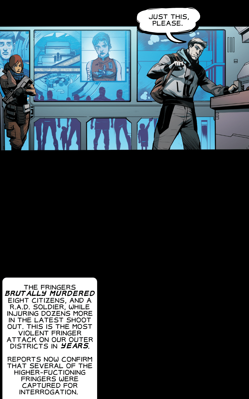 The shining city of Atrius protects its bustling Citizens from the unbridled dangers lurking beyond its walls, or so the government would have us believe. But when a government propaganda actor is sentenced to secret execution, his escape sets about the adventure of a defiant group of exiles and his first experiences beyond the safety of Atrius’ walls. With his city and home behind him, our hero turned conman must survive the lawless, post-apocalyptic expanse of The Fringe.