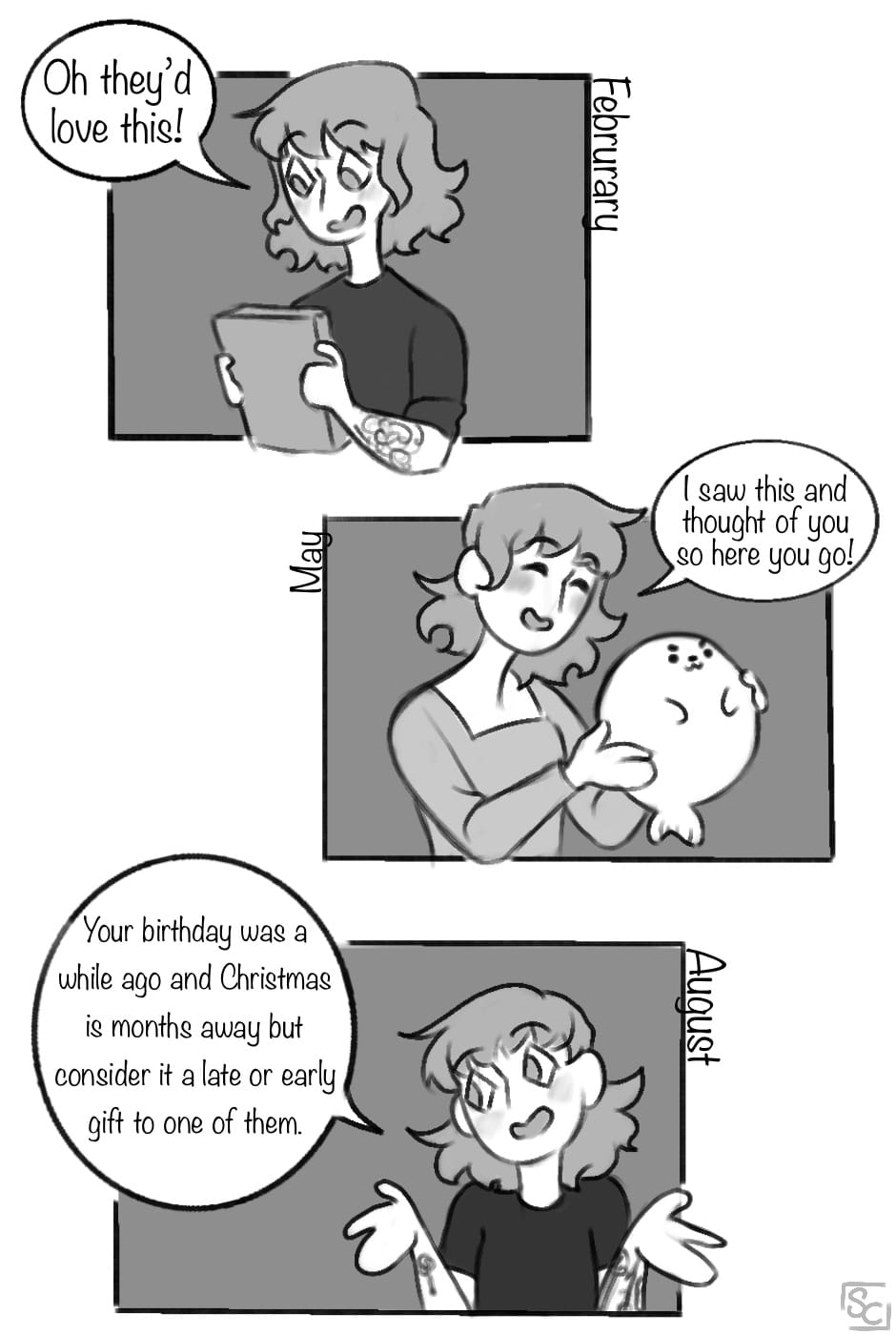 (EDIT: sorry the two pages were out of order TToTT) This always seems to happen. I’ve never liked the stress of getting a gift for a specific day