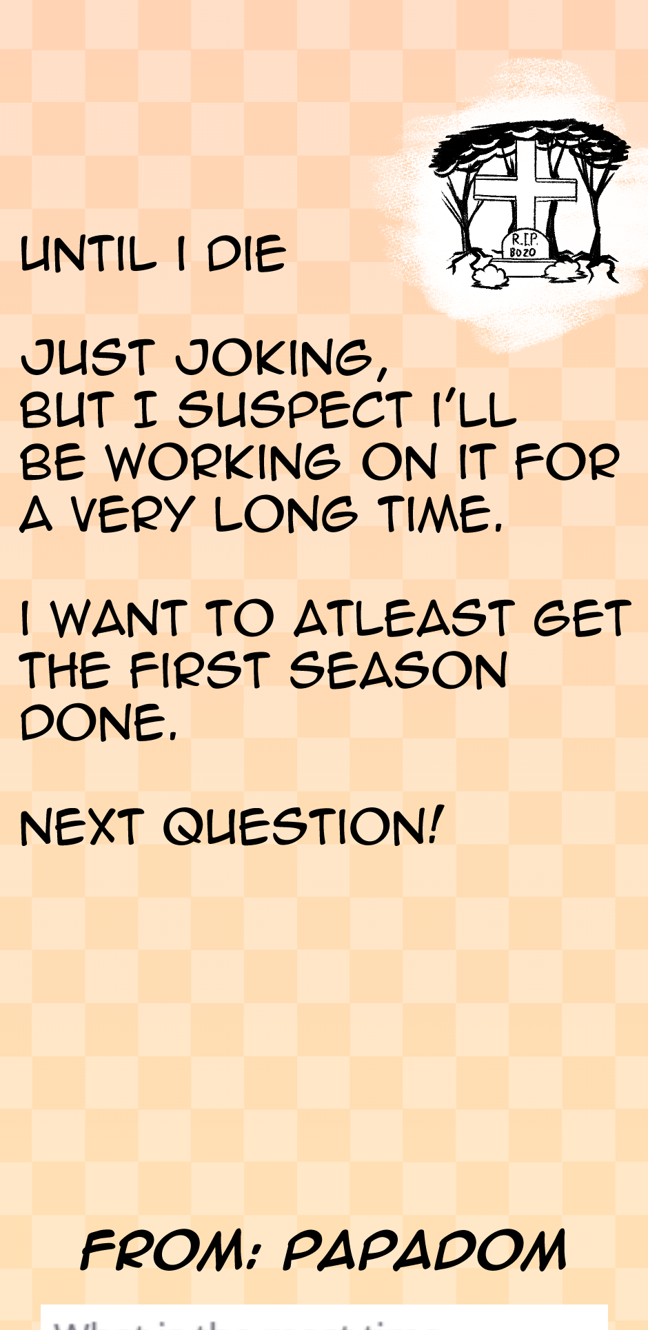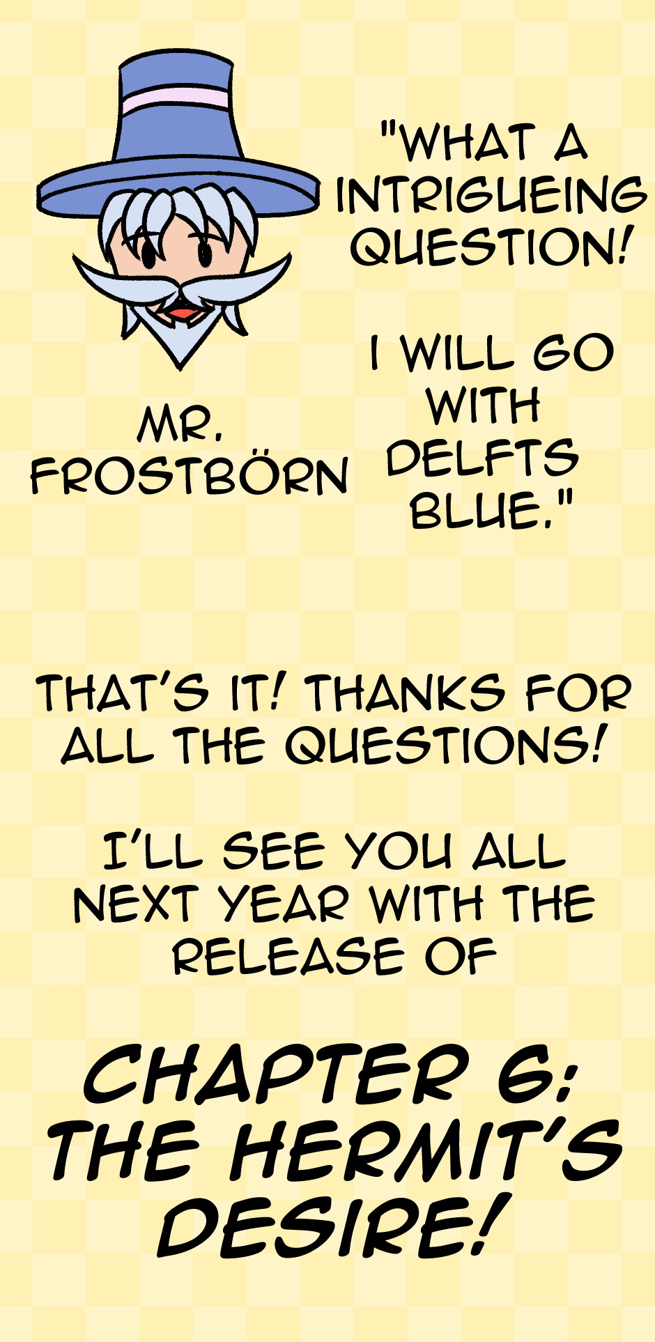 Thanks for the questions everyone! Hope to see you next year with chapter 6: The Hermit's Desire!