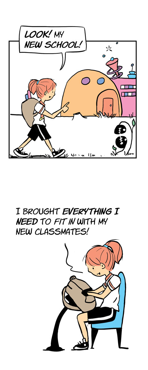 Whether she’s terraforming Mars’ moon Phobos after being left behind on a class trip, learning Martian as a Second Language, or asking a Martian classmate to be her date to the Red Planet Ball, Roxie’s just trying to fit in as an alien on an alien world. Roxie on Mars is a graphic novel told as a series of comic strips. New strips Mondays and Fridays through 2023.