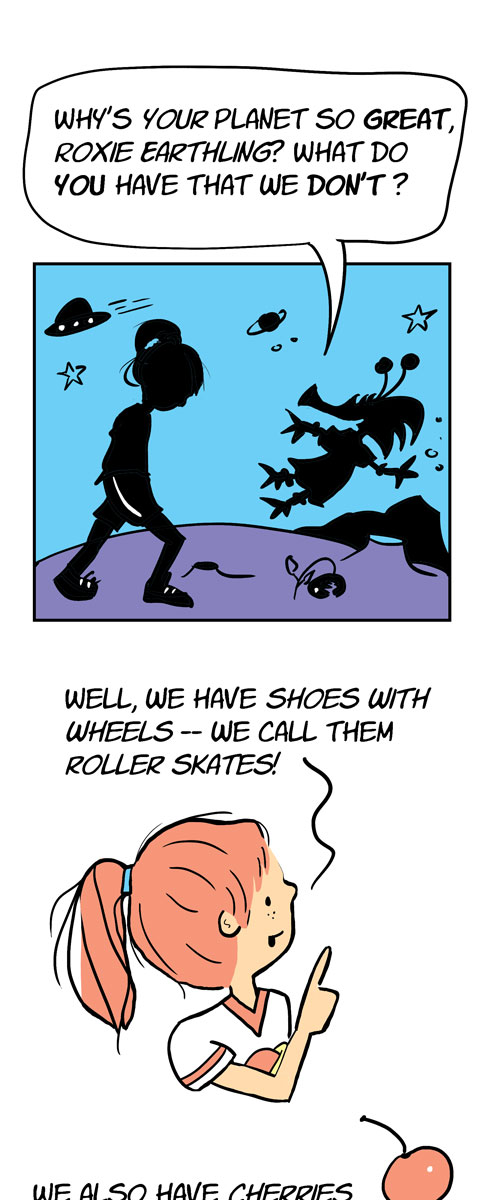Whether she’s terraforming Mars’ moon Phobos after being left behind on a class trip, learning Martian as a Second Language, or asking a Martian classmate to be her date to the Red Planet Ball, Roxie’s just trying to fit in as an alien on an alien world. Roxie on Mars is a graphic novel told as a series of comic strips. New strips Mondays and Fridays through 2023.