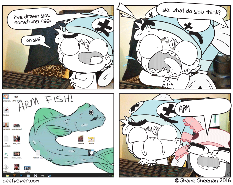 Google "Petrov, Yelyena and Me". Watch it and you will learn the origin of the arm fish http://beefpaper.com/?comic=trout-appendage
