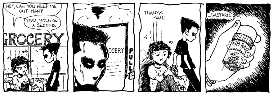 The Bastille, the coolest goth club in the country, is where Writhe [the new deejay], Shine [the sullen barback] , Boo [the sensible bartender], and Sven [the drunken owner] work and pass time. Coffee, clove cigarettes, scene politics, bitchy ex-girlfriends, and bad song requests are just a few of the aspects of their daily lives in this amusing and heart-felt look into the goth scene. Even though this comic is based in New Orleans, it accurately reflects any city where the kids wear black on the outside to show you what they’re feeling on the inside.