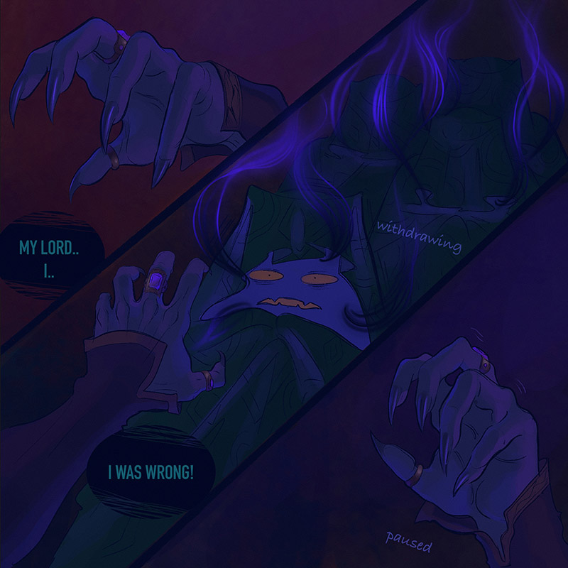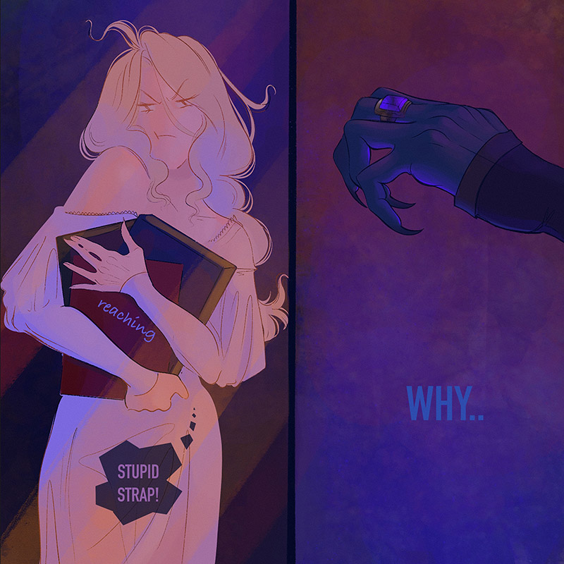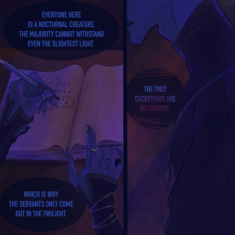 A dark gloomy castle with endless stairways and an ancient library. Scary, mysterious creatures live here, hiding in the night.