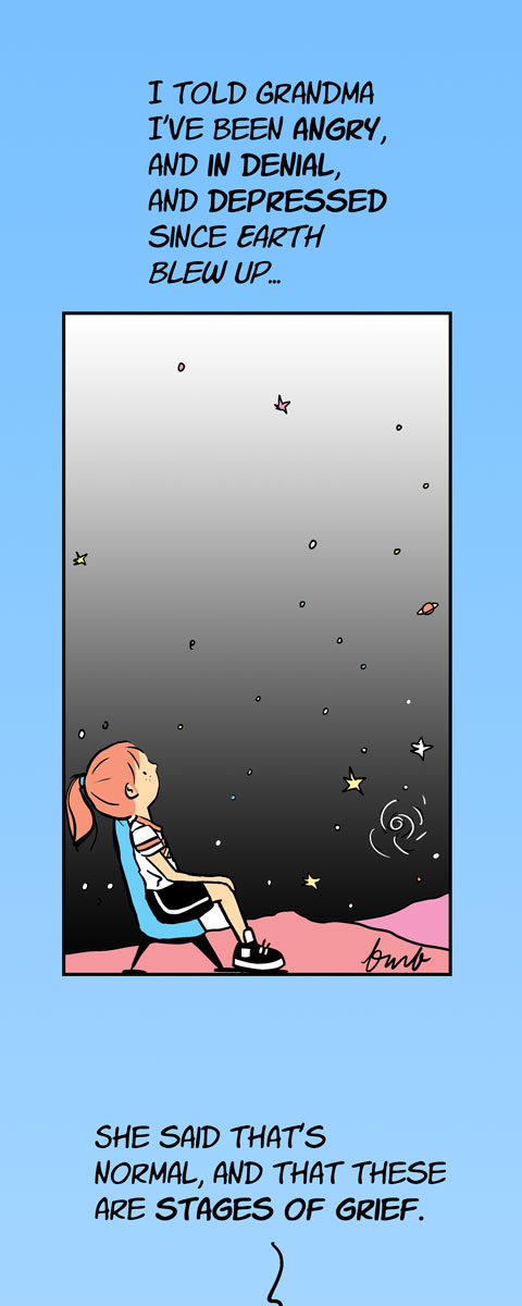 Whether she’s terraforming Mars’ moon Phobos after being left behind on a class trip, learning Martian as a Second Language, or asking a Martian classmate to be her date to the Red Planet Ball, Roxie’s just trying to fit in as an alien on an alien world. Roxie on Mars is a graphic novel told as a series of comic strips. New strips Mondays and Fridays through 2023.