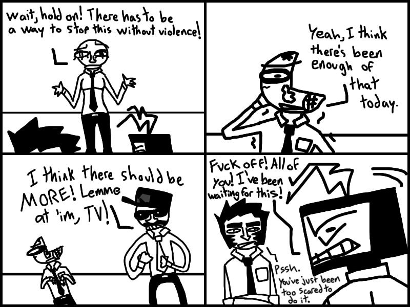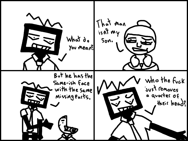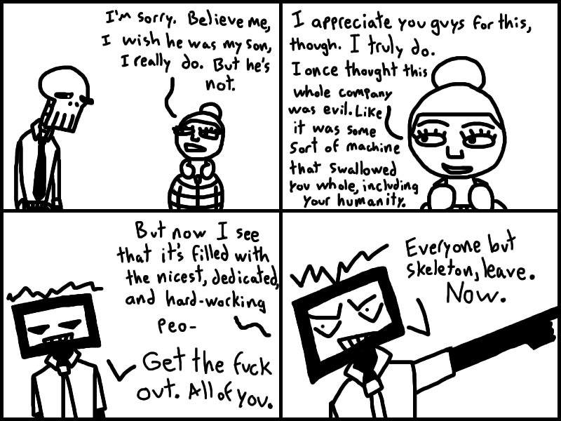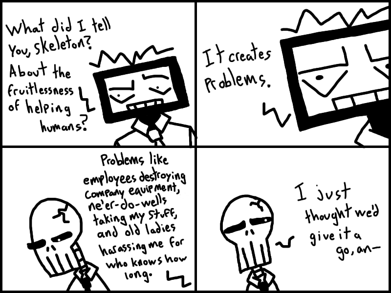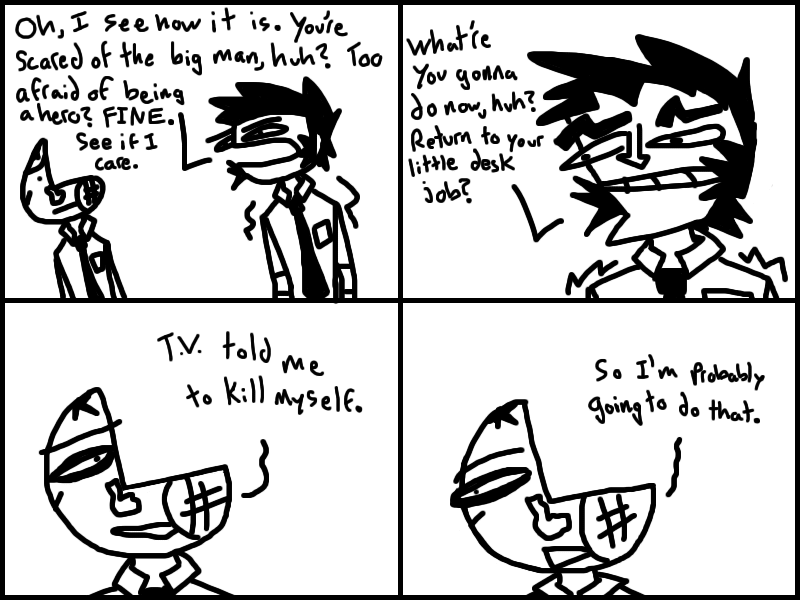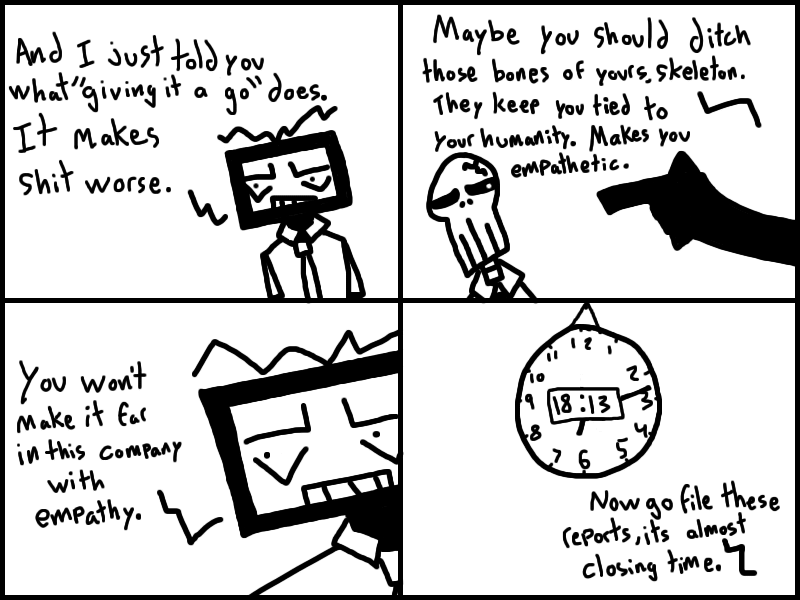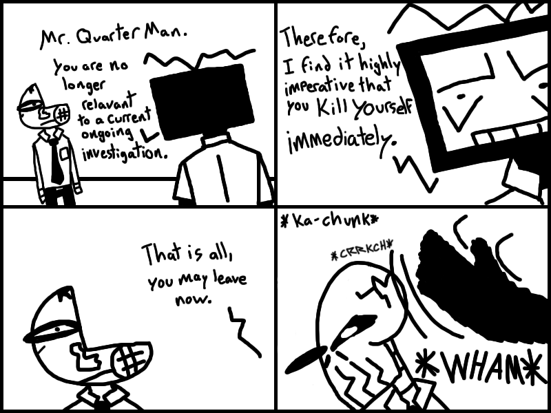 Office-ally Dead is set in a world where people trade in parts of their own bodies for mad dosh. Follow an amnesiac nicknamed "Quarter Man" as he struggles to do... anything, really.