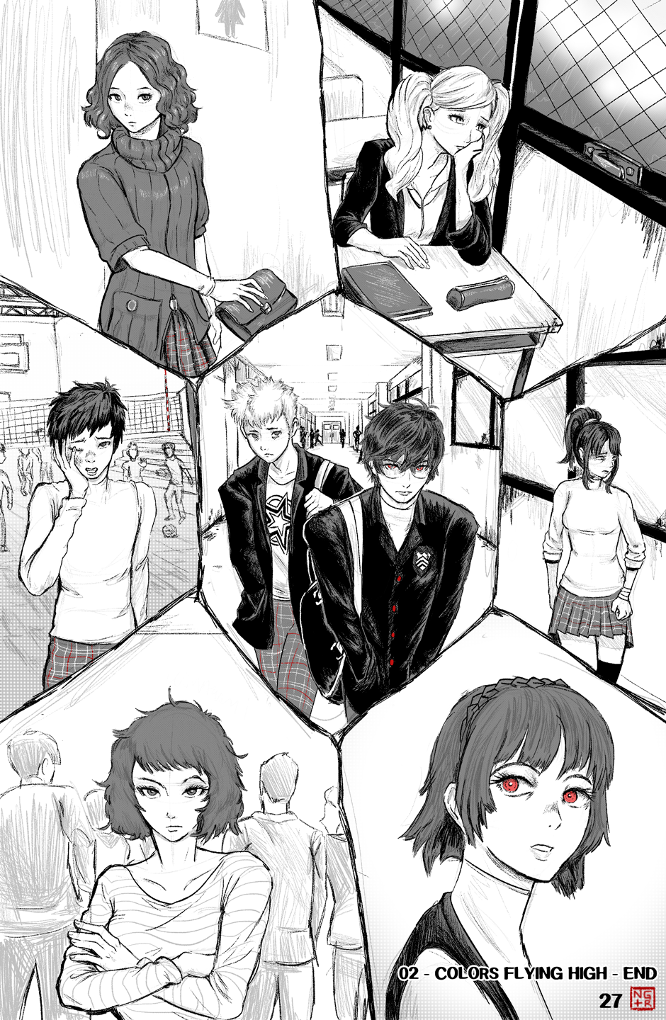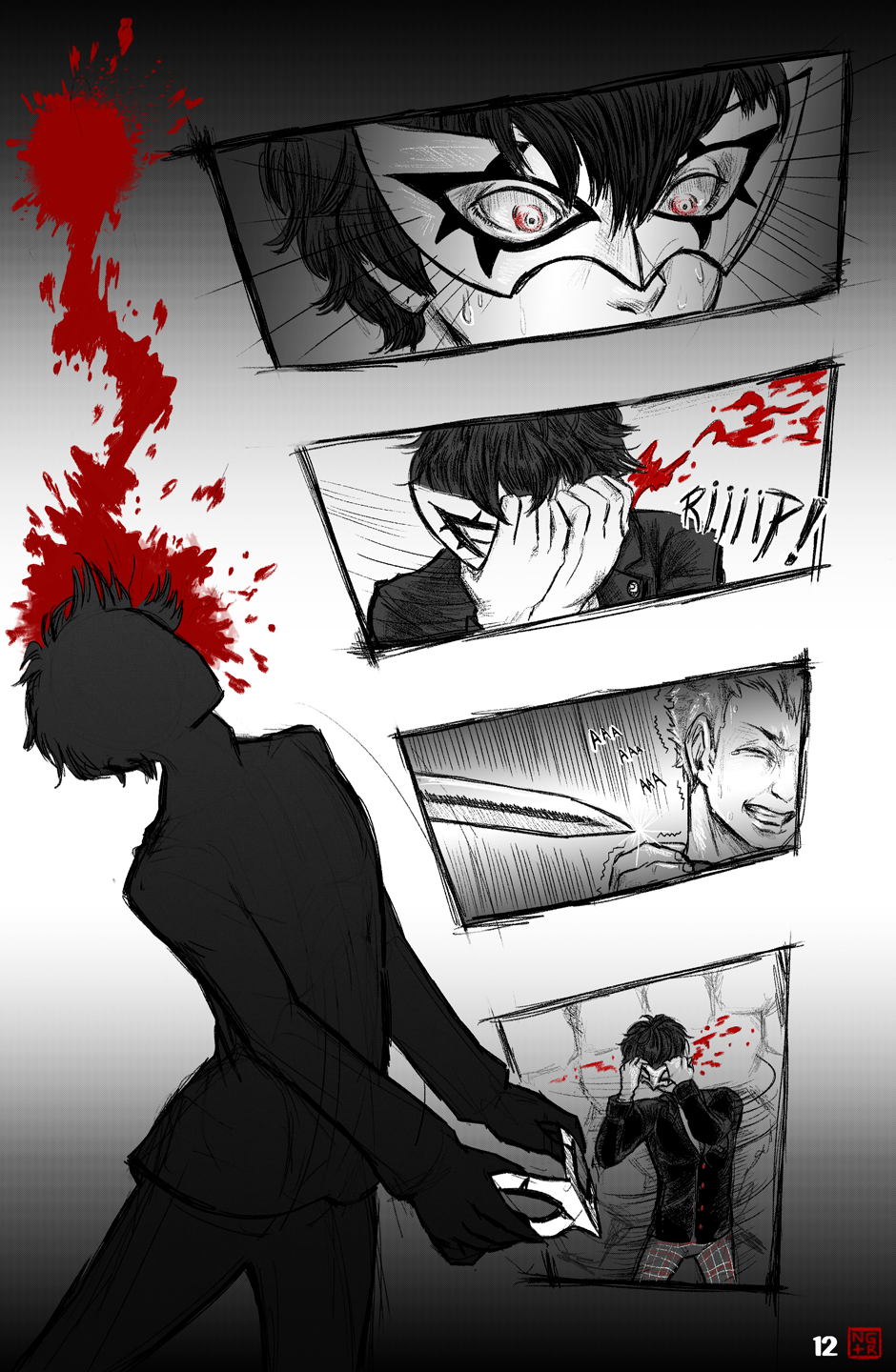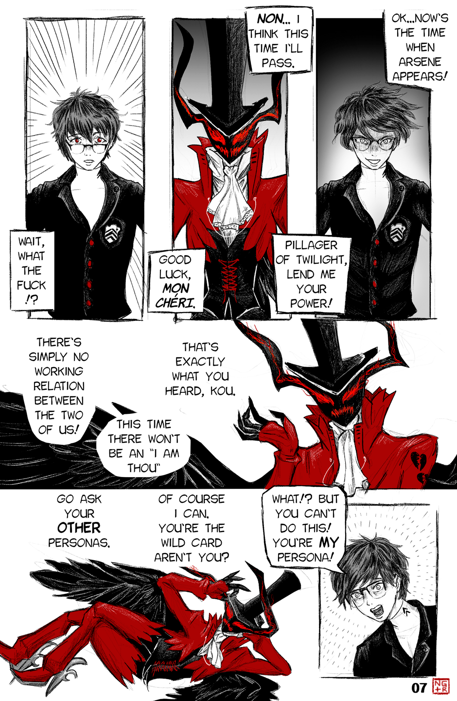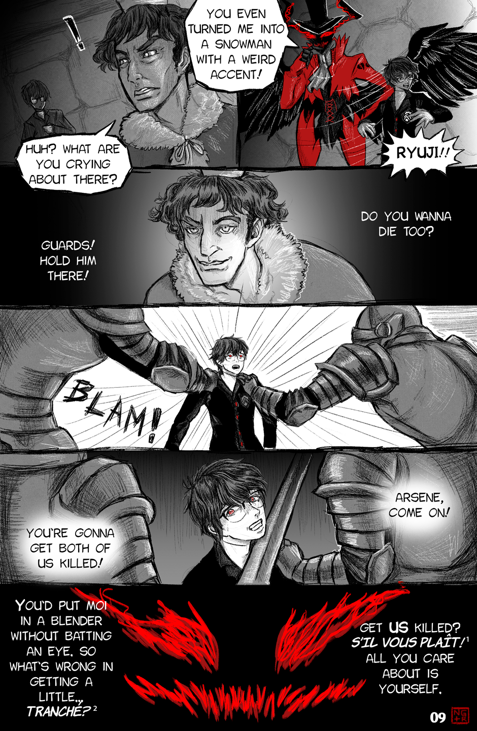 The upgrade of art and direction from the P5XP ending has become even more extensive. Arsene's appearance with the transition from Akira's face to the glowing eyes and grin of the Pillager of Twilight really looked memorable, the scene with Akira and Ryuuji's chattering is unbearable, as it should be. More color pages and artful transitions between frames are nice.
