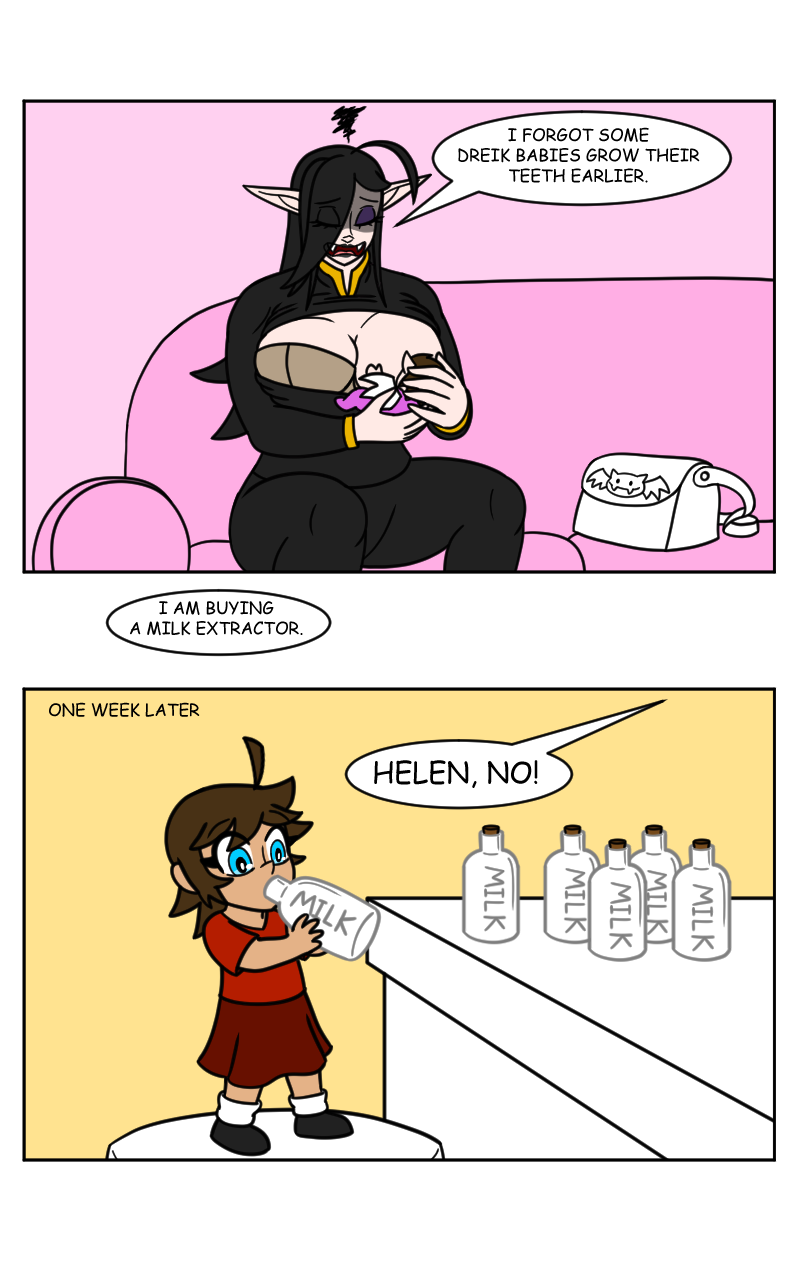 Helen is smart enough to be able to read and avoid strange bottles with dangerous liquids, but she isn't smart enough yet to question why there are many milk bottles at the table of the kitchen.