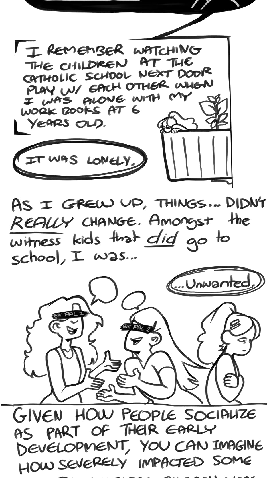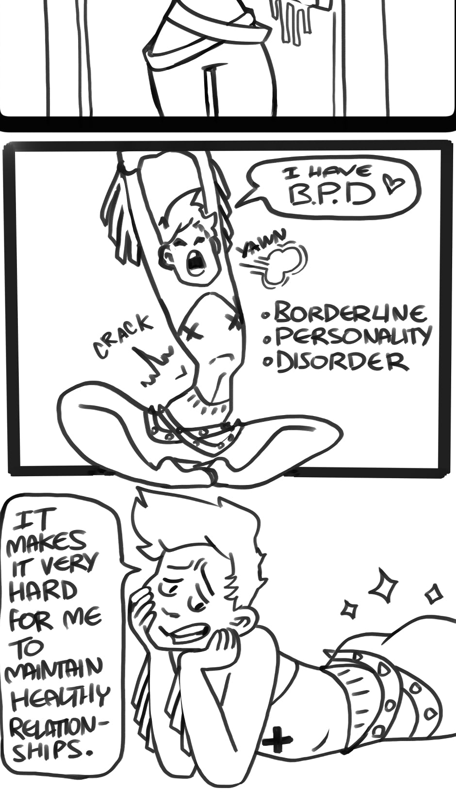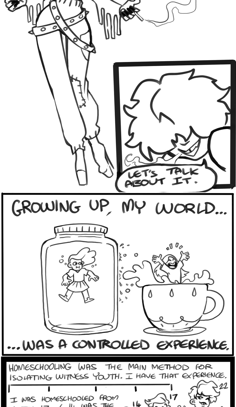 TW: Mentions of childhood indoctrination and isolation. Discussions around undiagnosed and diagnosed Borderline Personality Disorder. Brief implications around the idea of negative, toxic relationships. Single panel mention of predators.