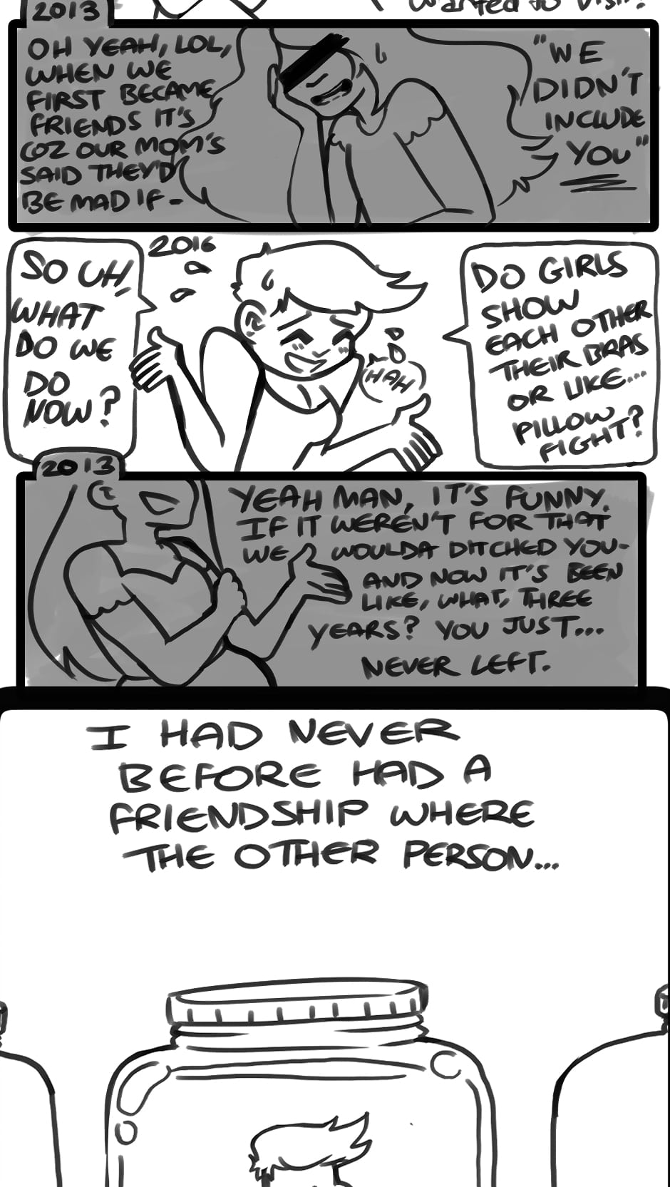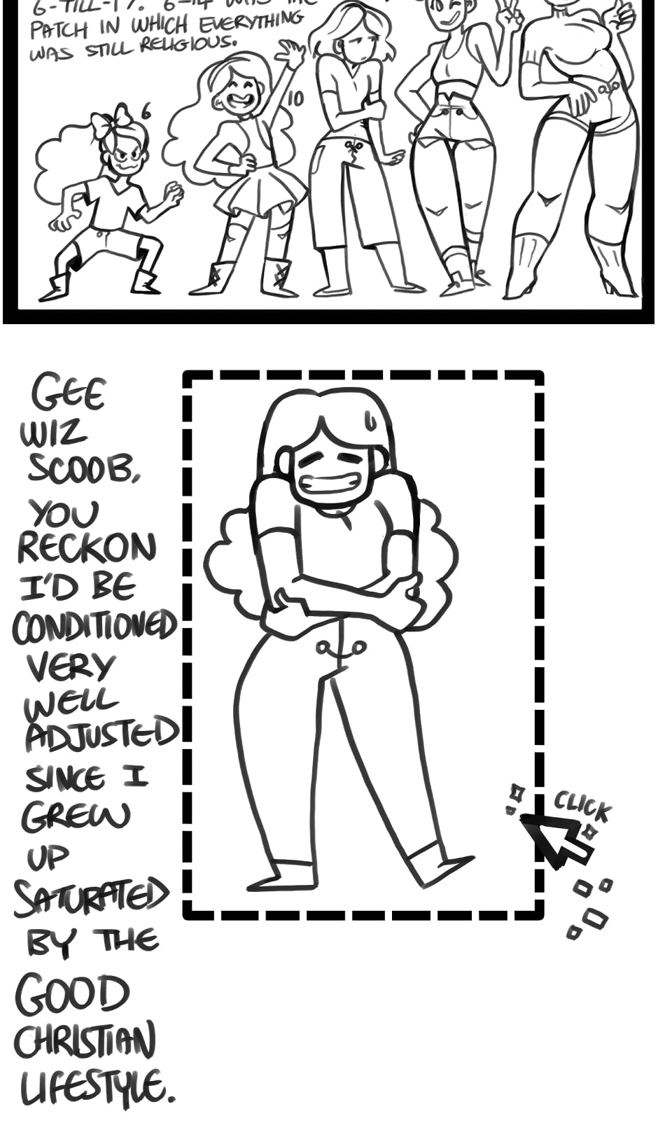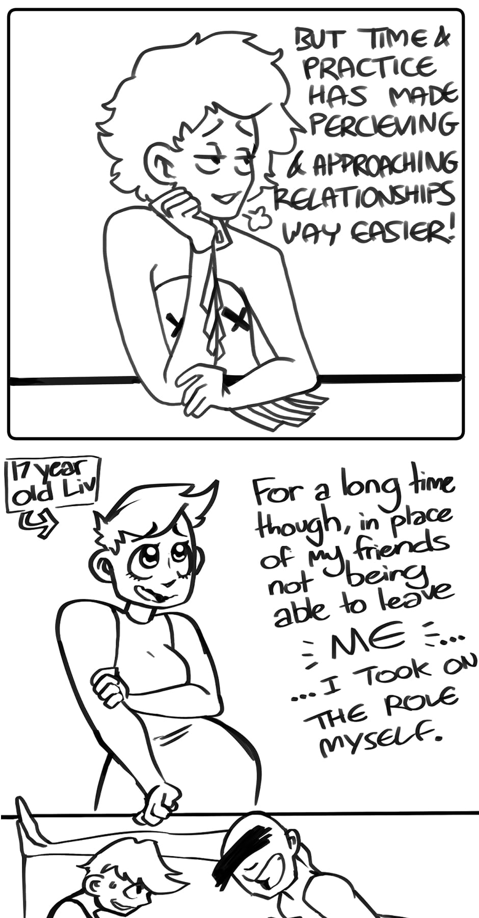 TW: Mentions of childhood indoctrination and isolation. Discussions around undiagnosed and diagnosed Borderline Personality Disorder. Brief implications around the idea of negative, toxic relationships. Single panel mention of predators.