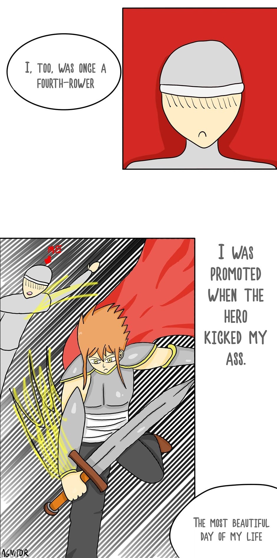 The comic's plot focuses on an ordinary background mercenary. While the hero saves the princess and heroically fights the lord of demons, the background guy can only watch. One day his life changes dramatically when he becomes the center of the action.