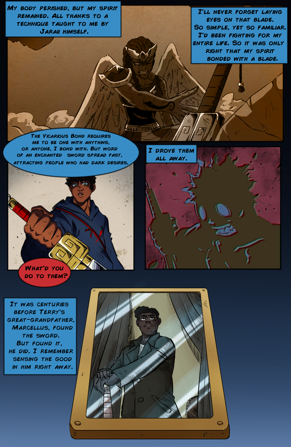 I love the portrait at the end for a variety of reasons. First being, I love the pose. Classic. But secondly, I love how it connects the characters together. Bond of the Blade? Bond of the Bloodline! I love seeing stories where a cool family history is part of a character's background. Great upload all around!