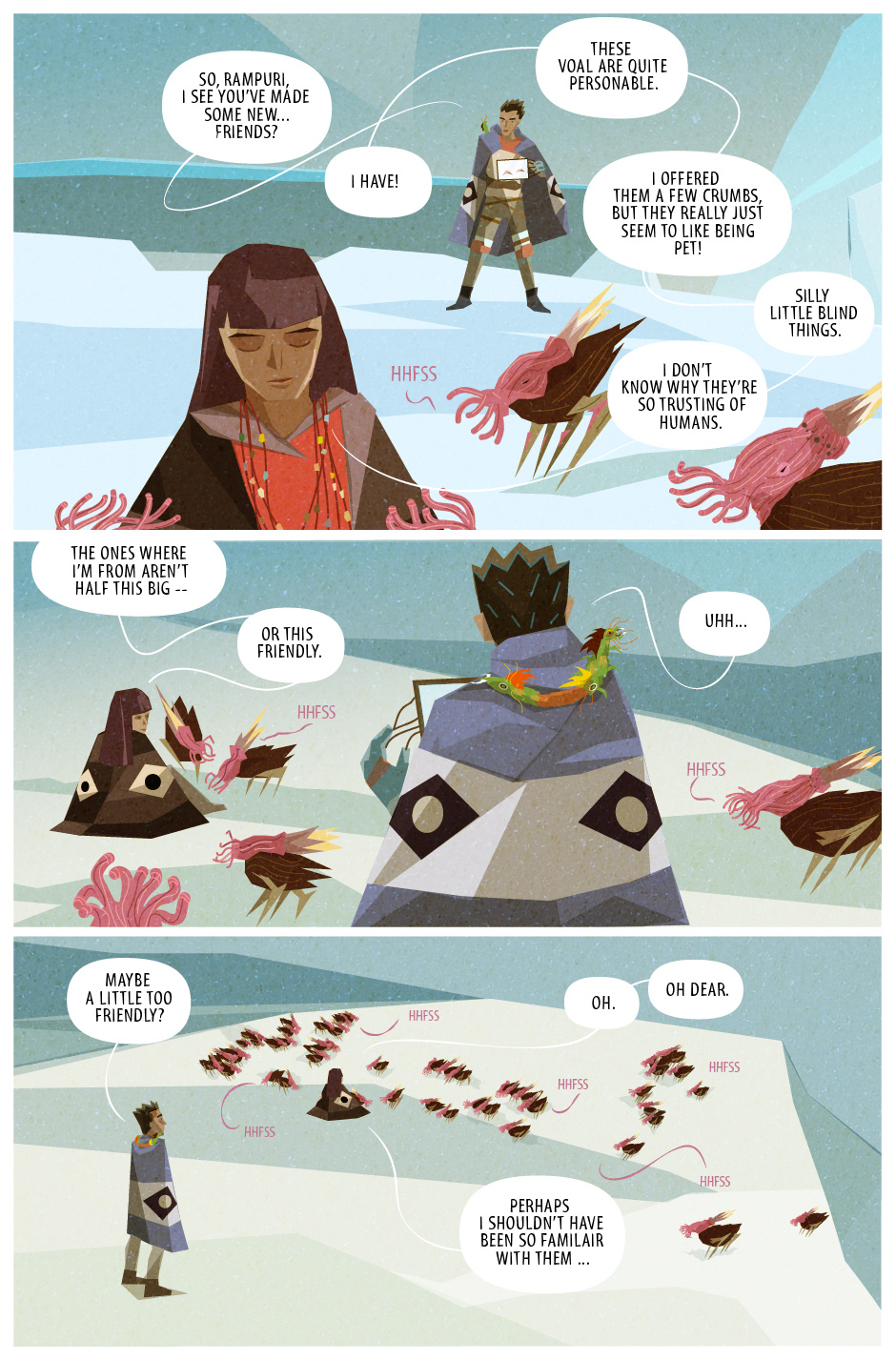 Wow, this comic's art style is fantastic! I love the sharp edges, and the textural details. Your font and lettering is also crazy gorgeous. Well done! I can't wait to see how this adventure continues.