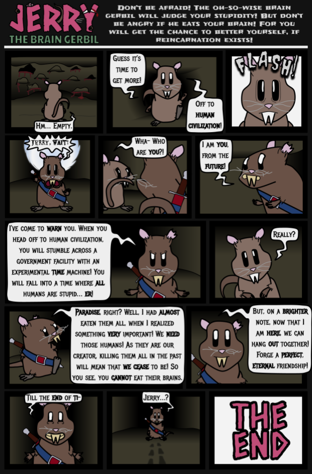 END STRIP: Immortal brain gerbil Jerry is an escaped lab experiment wandering the sands of the Sahara desert; looking for the brains of idiots to either feed on, or make smart again.