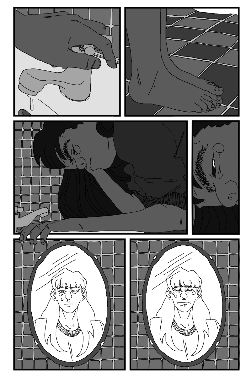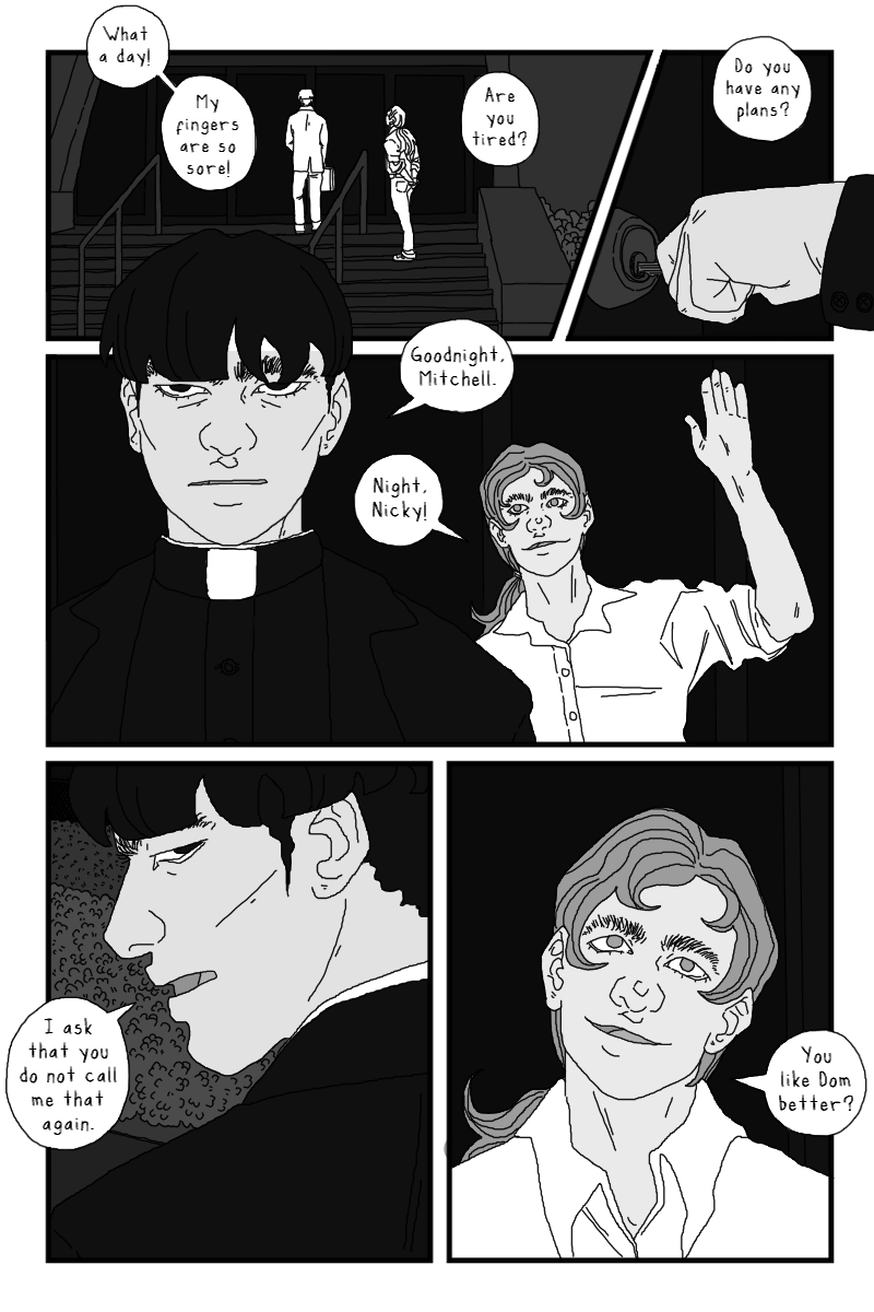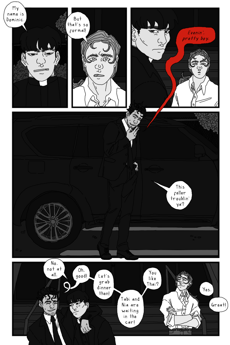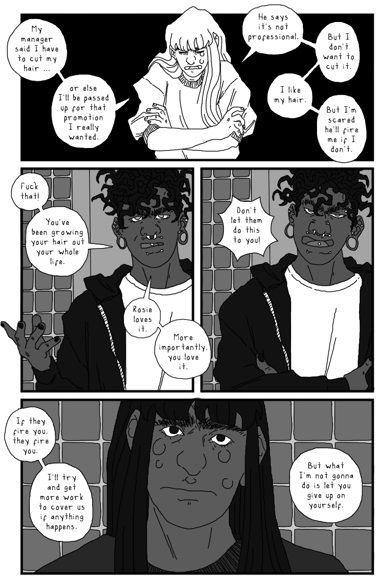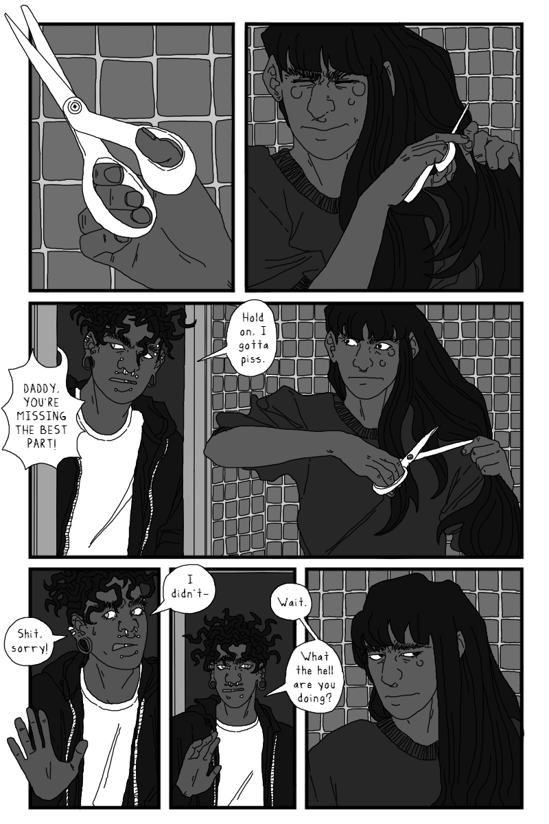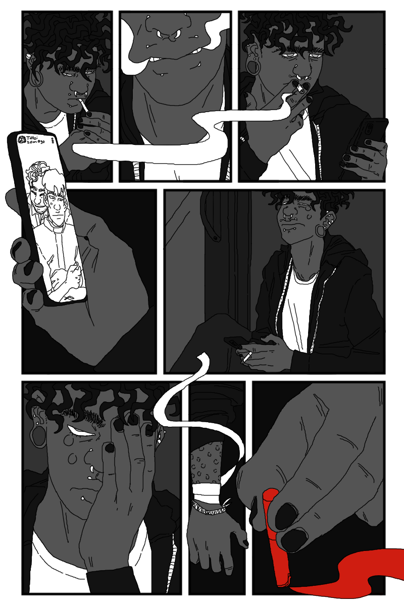 Aiden and Onyx 🥺. I was wondering how they'd make up, and I suppose it isn't really any problem actually being solved, just them being able to talk again. Which if you're living together was gonna be sooner or later. I loved the scene a lot, Aiden is so sweet (and also funny) and the trust and support they have for each other is so lovely. I'm so glad Onyx is keeping her hair. Then that final twist of the knife with Aiden seeing the picture of them together... I was a little unsure of whether the fucking asshole was Tabi for posting that or Dom for hanging out with her. Or both I suppose. I love the Aiden expressions on that page, the bottom left one is possibly my favourite Aiden yet. And then the composition on the final page is super good, especially loving the hand placement.