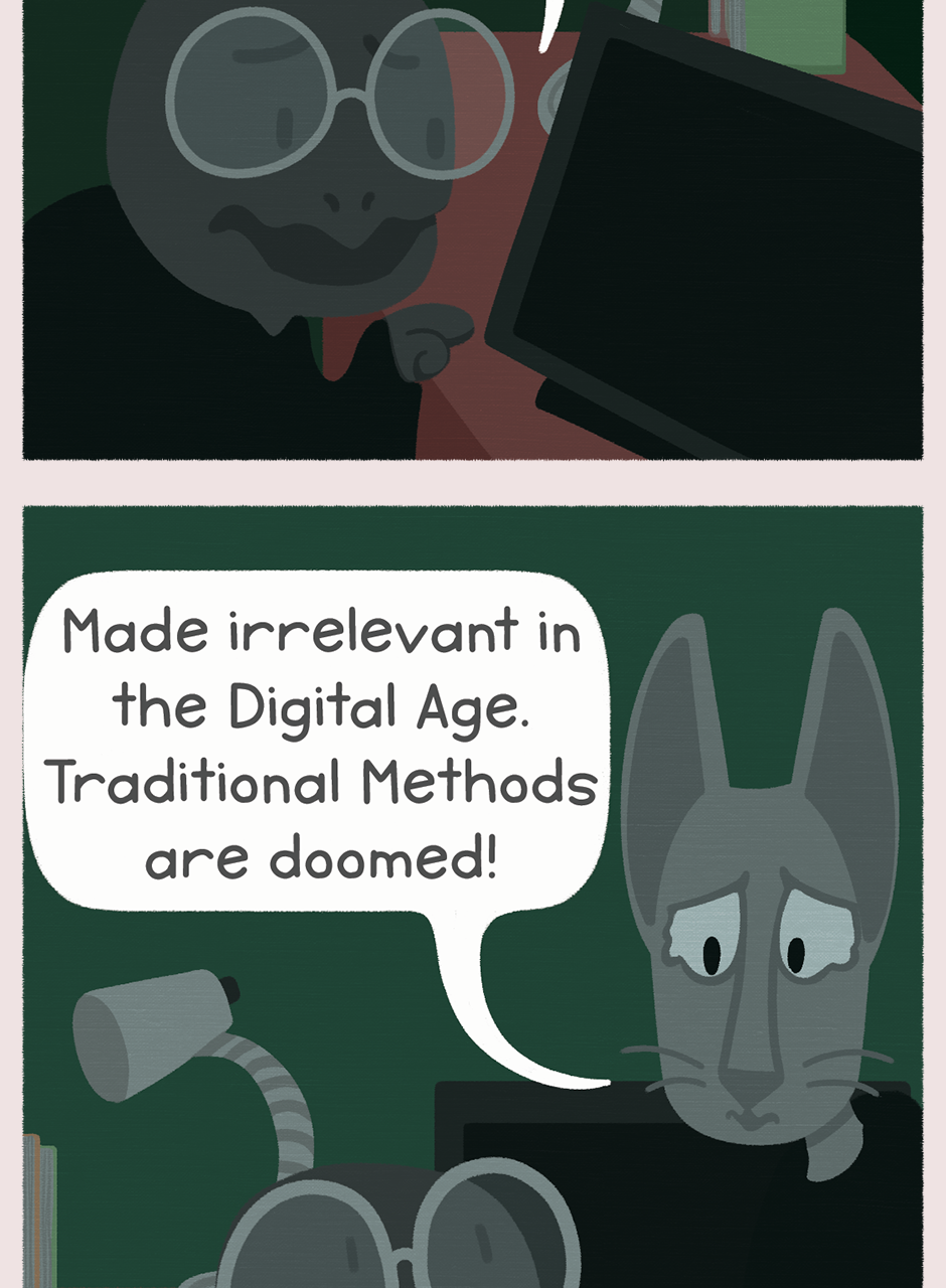 An exploration of the societal value and expectations of the arts in relation to science, told through real and exaggerated experiences of a young artist trying to coexist with the digital age.
