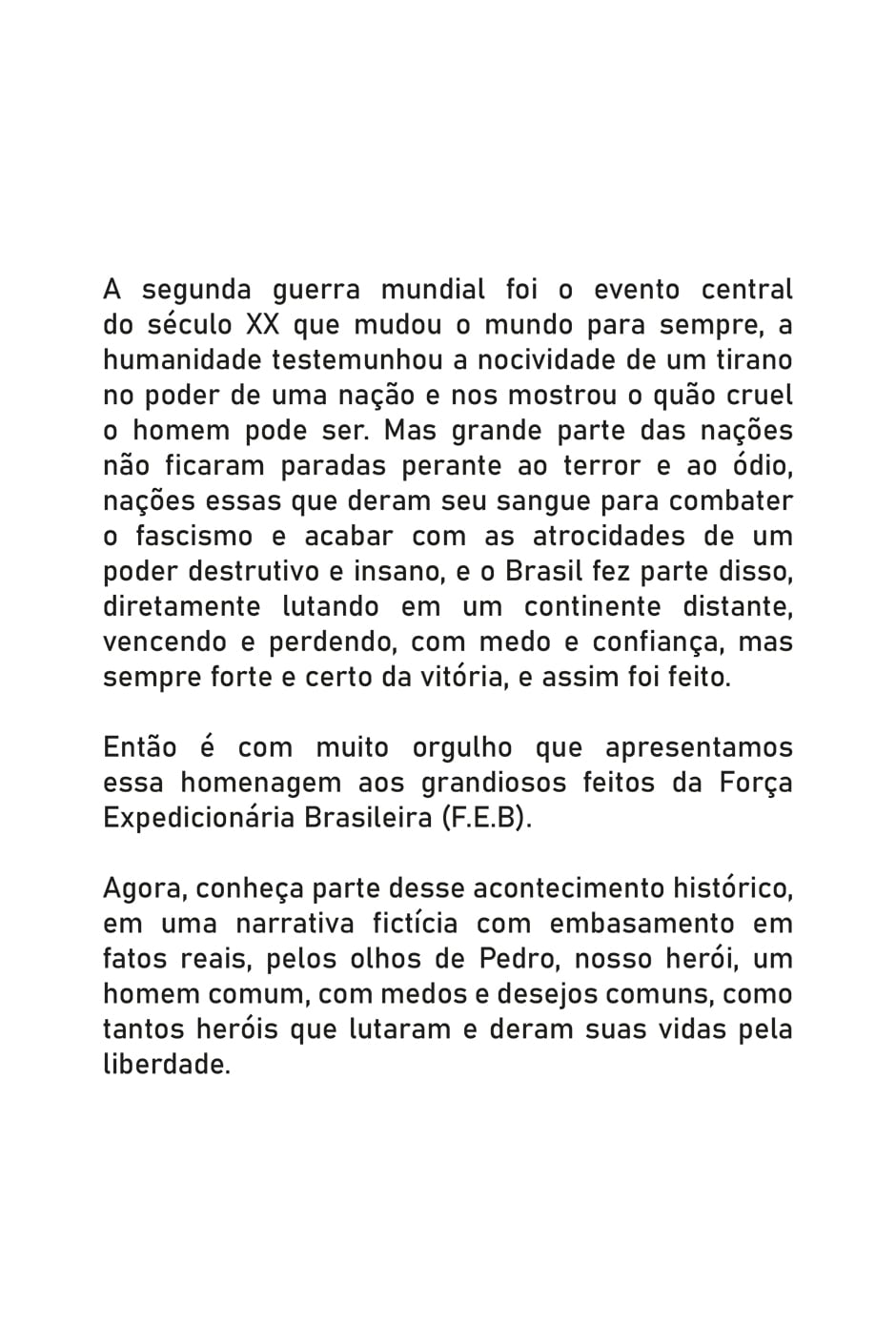 A segunda guerra mundial foi o evento central do século XX que mudou o mundo para sempre, a humanidade testemunhou a nocividade de um tirano no poder de uma nação e nos mostrou o quão cruel o homem pode ser. Mas grande parte das nações não ficaram paradas perante ao terror e ao ódio, nações essas que deram seu sangue para combater o fascismo e acabar com as atrocidades de um poder destrutivo e insano, e o Brasil fez parte disso, diretamente lutando em um continente distante, vencendo e perdendo, com medo e confiança, mas sempre forte e certo da vitória, e assim foi feito.