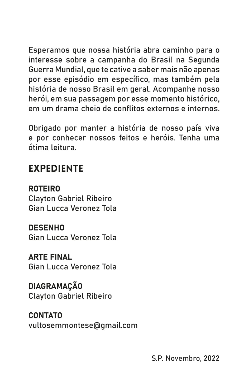 Esperamos que nossa história abra caminho para o interesse sobre a campanha do Brasil na Segunda Guerra Mundial, que te cative a saber mais não apenas por esse episódio em específico, mas também pela história de nosso Brasil em geral. Acompanhe nosso herói, em sua passagem por esse momento histórico, em um drama cheio de conflitos externos e internos.