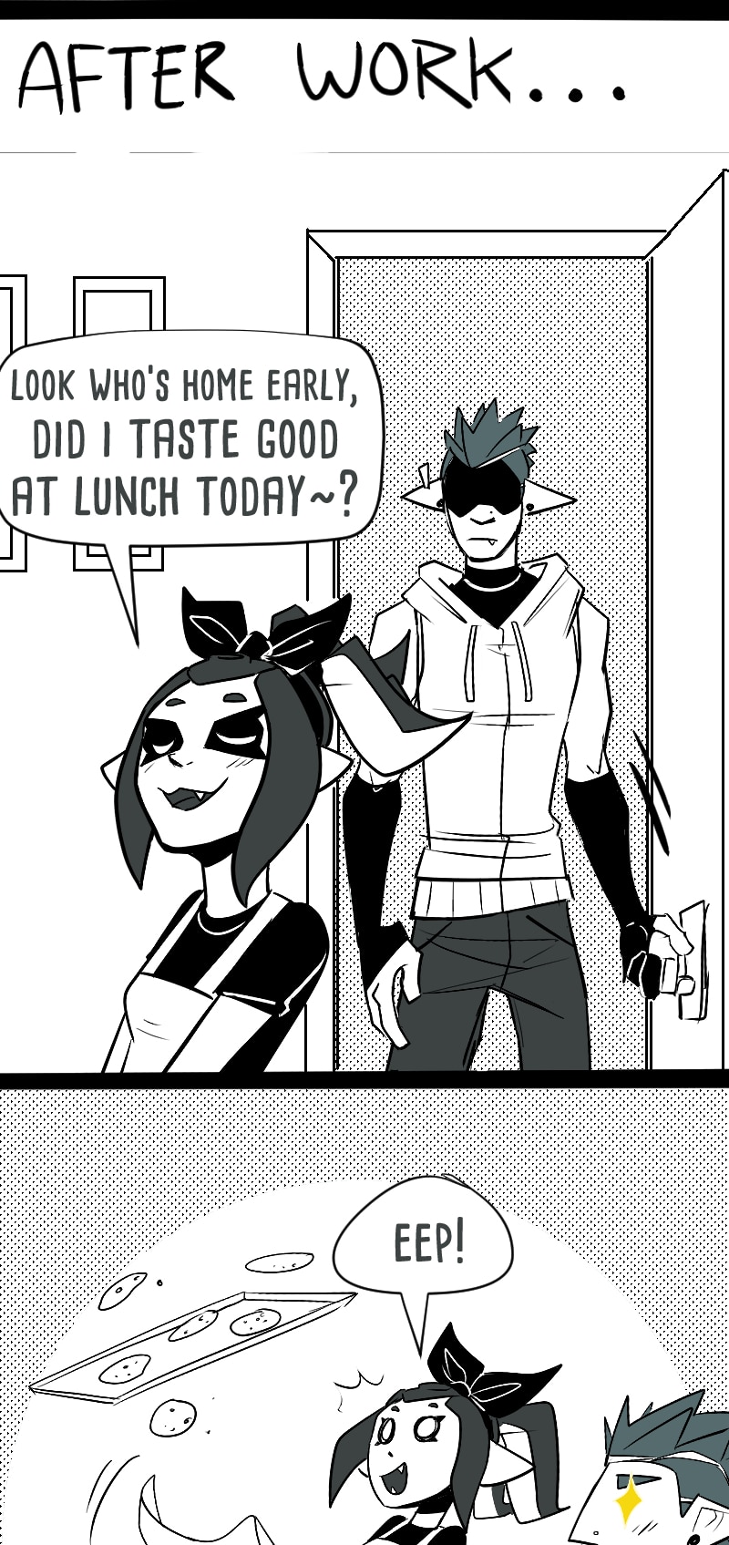 My friend and I saw a picture of those little hot dog octopus EXCEPT these ones had little 'bows' on top that looked just like Rila's headband so I HAD TO MAKE THIS COMIC. Hahah