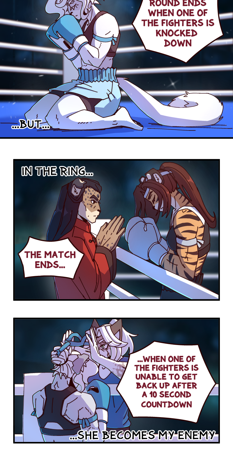 Who will prove to be the better fighter? The militarily trained warrior made for combat? Or the street-hardened street-smart woman from the dark alleys? Will Antares' discipline and training be enough to overcome a height and weight disadvantage or will Sierra's grit overwhelm the Avelaris soldier? The rules are simple. A round lasts until someone goes down. The fight lasts until someone can't get up. No excuses. Only one winner and one loser!