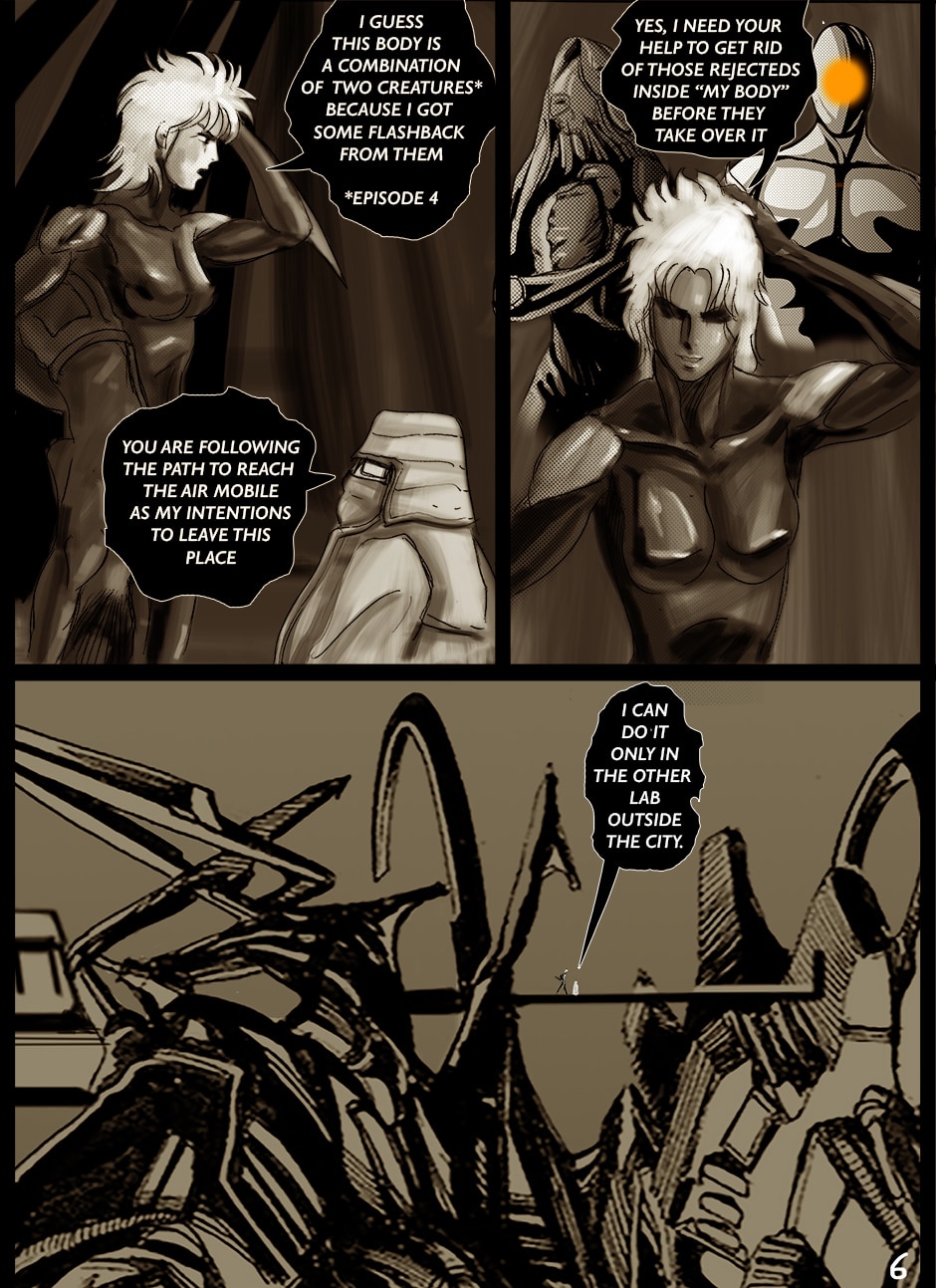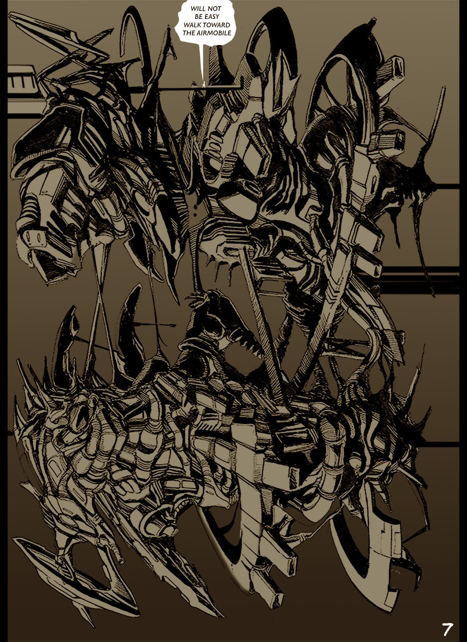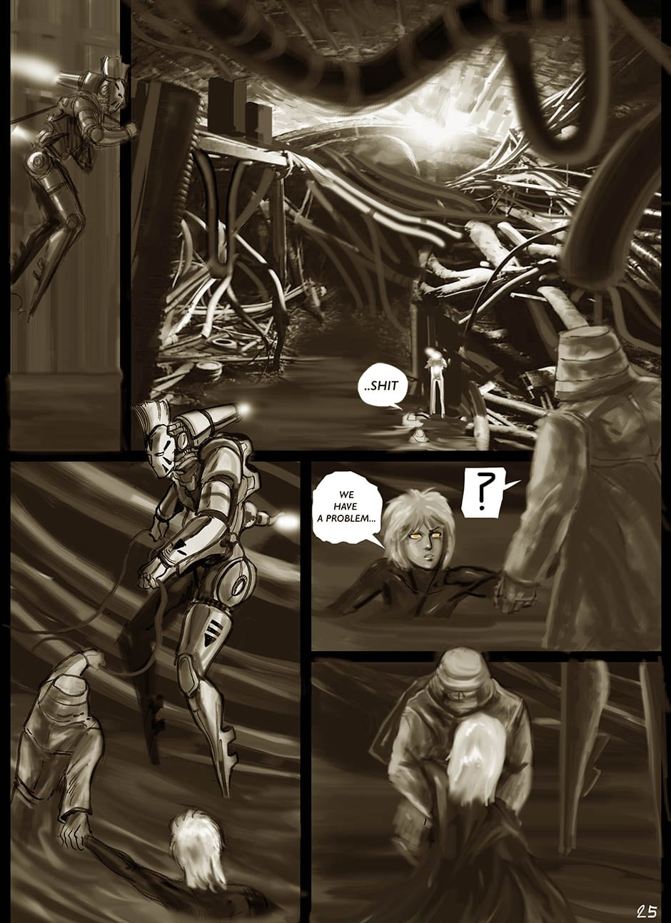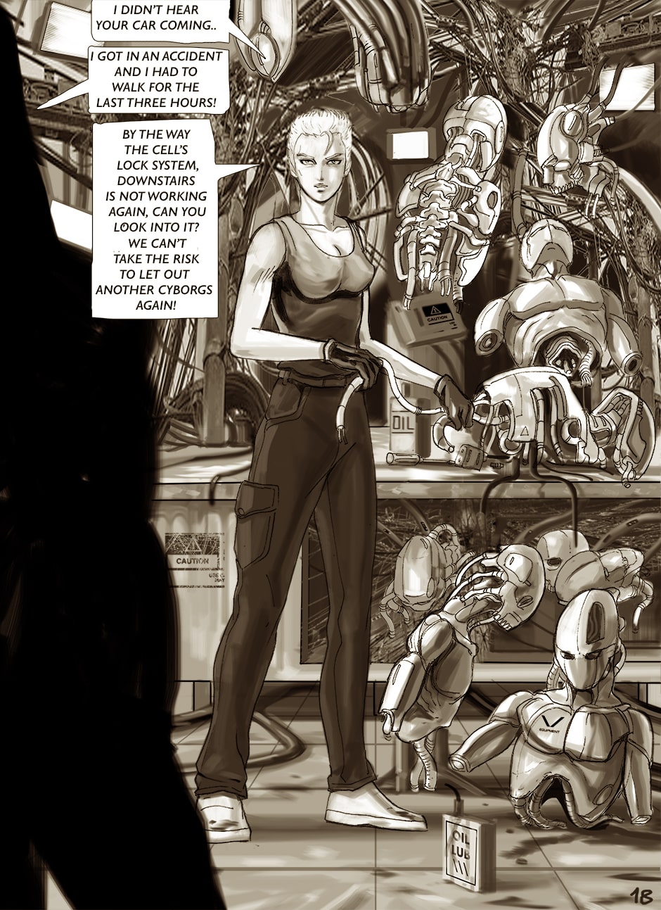 I cannot turn away from this feast of cyborgs and mechanics for my eyes! Ghost in the Shell, Predator, Alien all combined to treat us in this comic. I love your art. You actually tell your story through panels of storyboard. Fantastic work. I think I'm picking up on the main characters, though they can change their faces in a blink!
