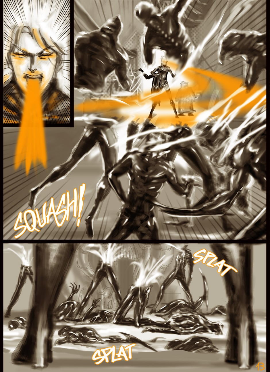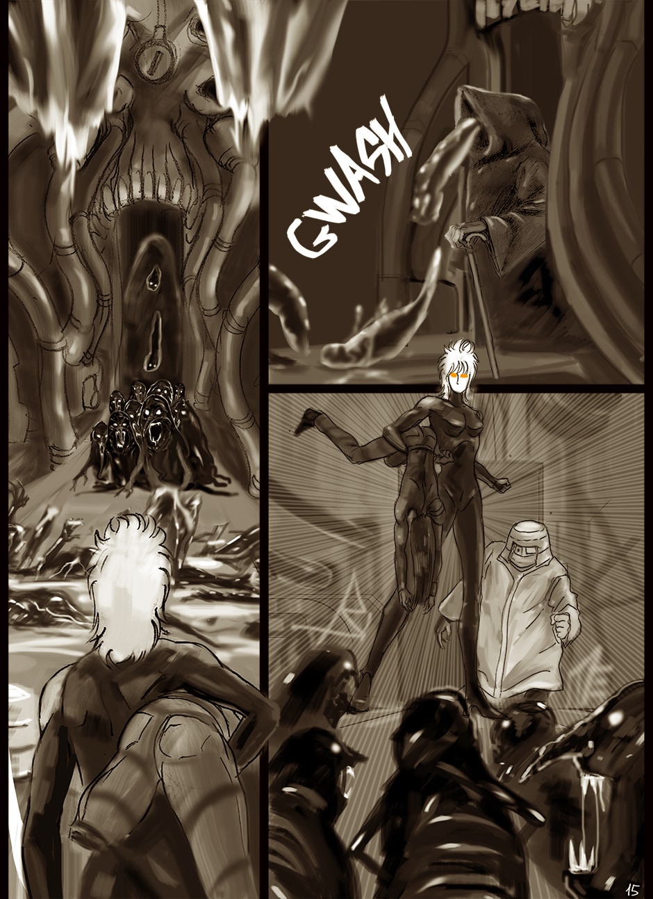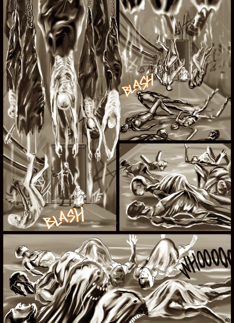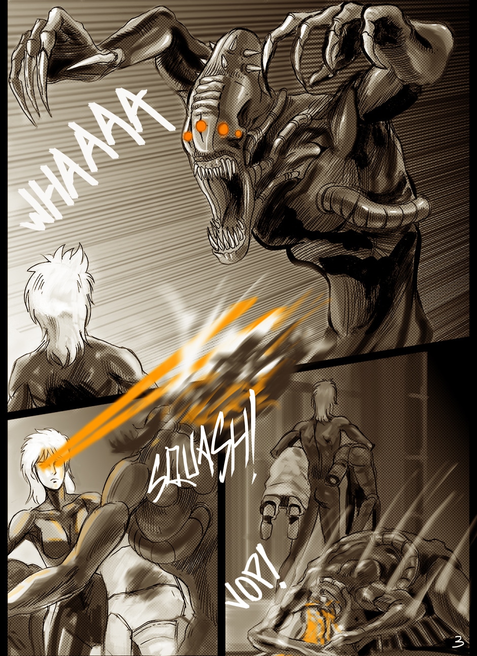 I cannot turn away from this feast of cyborgs and mechanics for my eyes! Ghost in the Shell, Predator, Alien all combined to treat us in this comic. I love your art. You actually tell your story through panels of storyboard. Fantastic work. I think I'm picking up on the main characters, though they can change their faces in a blink!