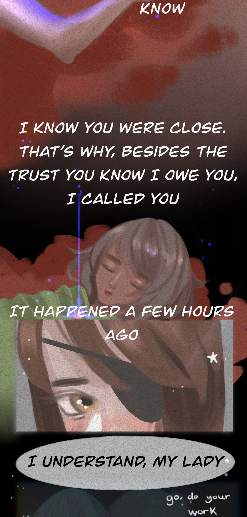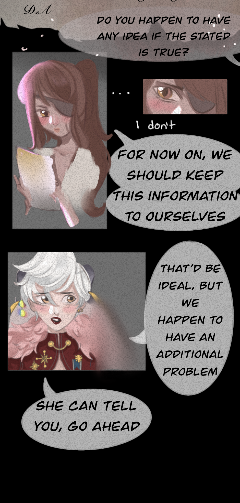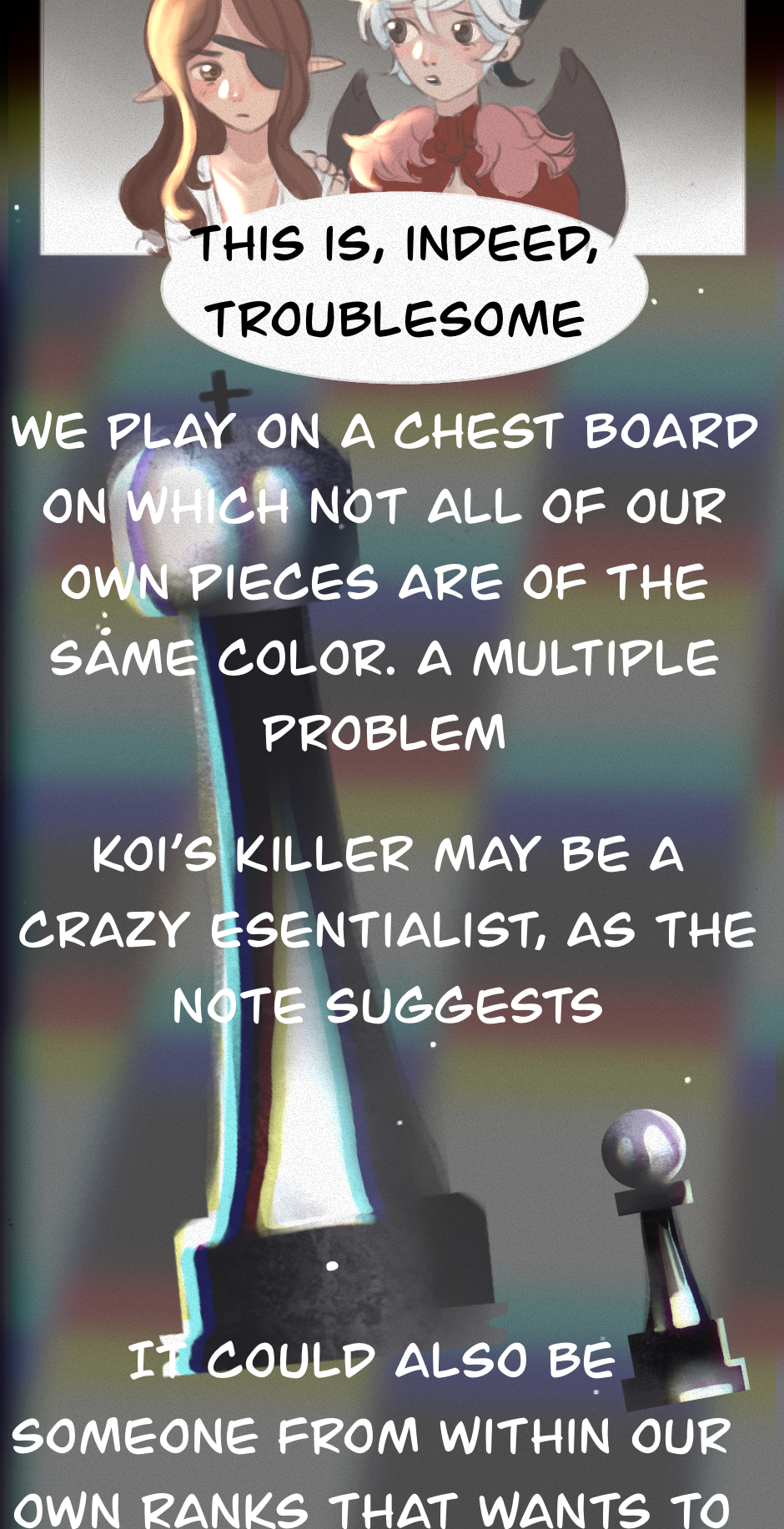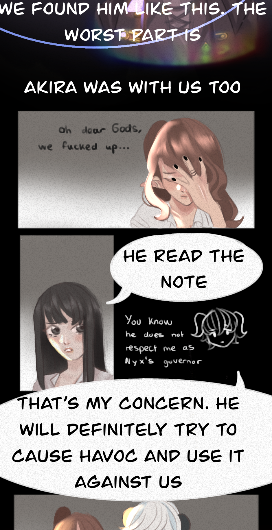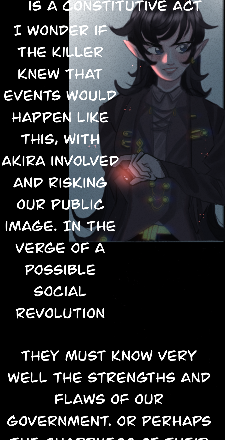 A m-murder??? :0 That seems problematic indeed xD especially if the murderer is as strong as they expect. I also have to say that you draw the light situation so well, I love the highlights when the characters speak, it makes them look super epic while they say epic things xD 💕