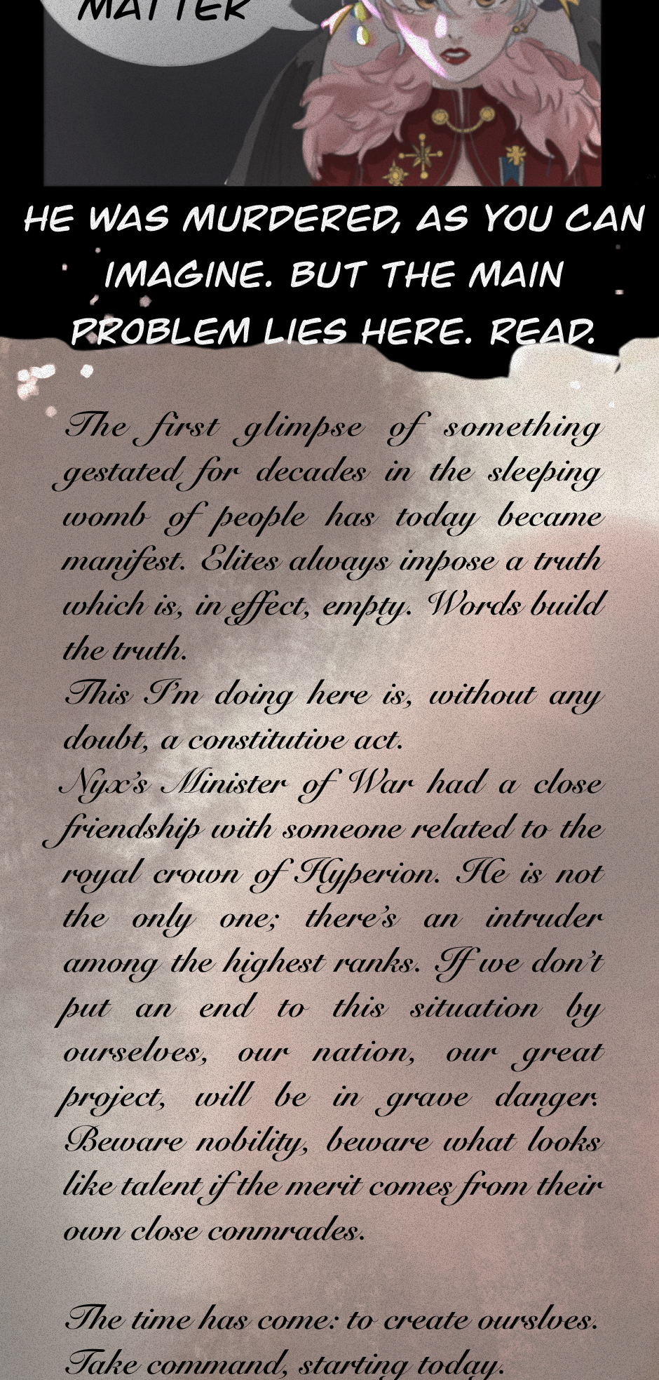 Hope you get to enjoy this episode and the 'political trama' here! (forgive me, I major philosophy and politics, this is gonna be an absolute mess)