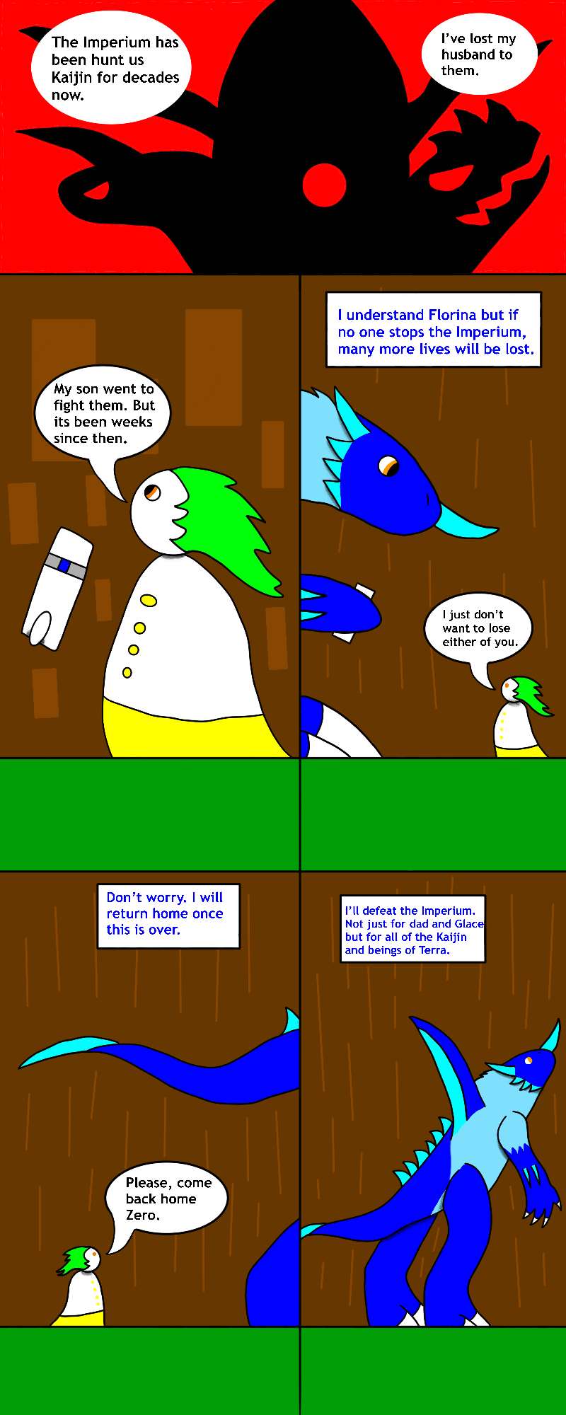 Sort of speed ran this page. Could be due to that I planned this story ahead of time so I understood what to do. Alternatively, I just wanted this page done. Either what say goodbye to Alchema village cause now the story truly begins. Also friendly reminder Zero doesn’t speak at all. Those boxes are his thoughts.