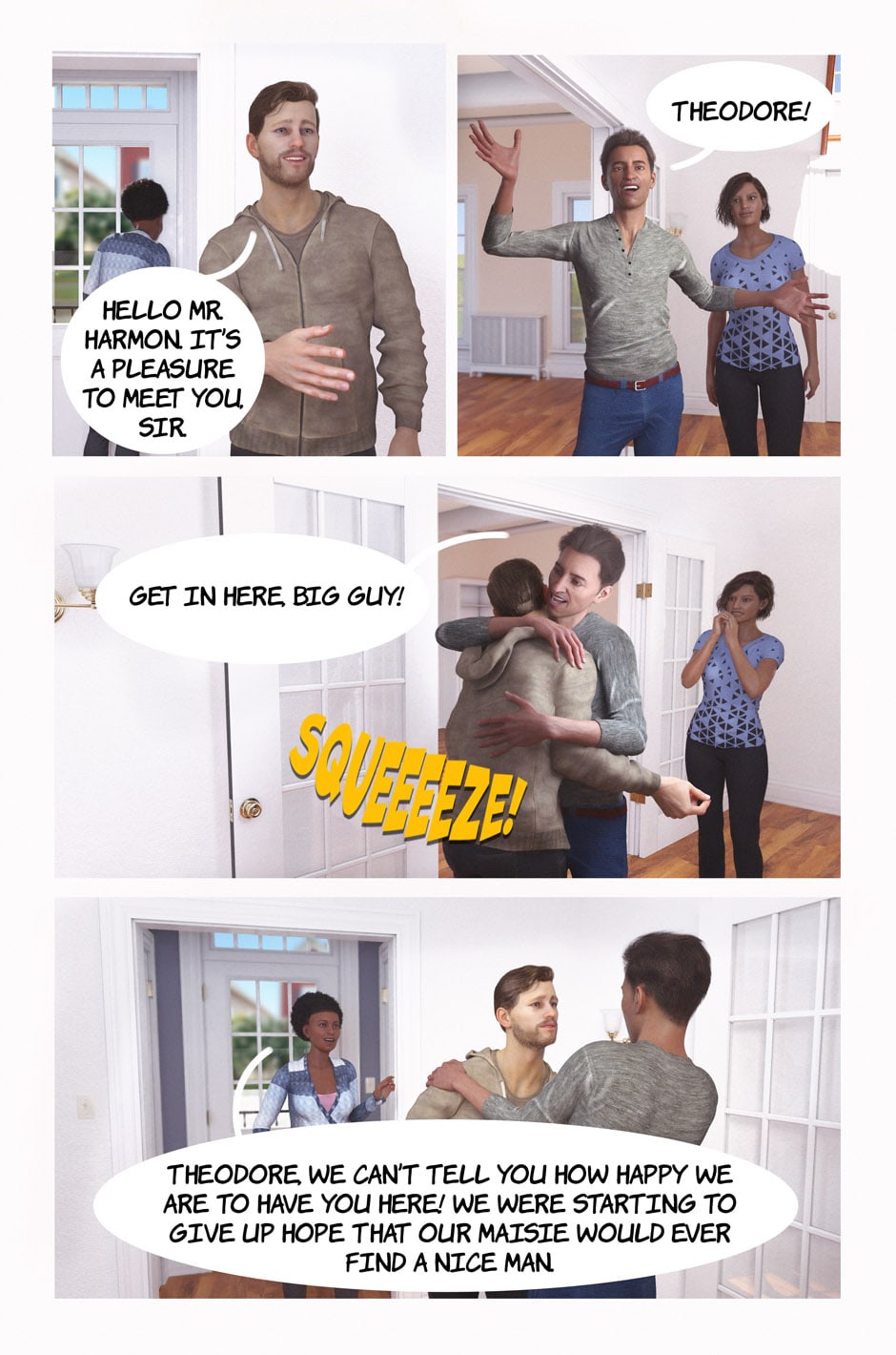 The final page of hugs. I felt like the last 10 panels were all different hugs! The middle panel here was the hardest one, because I really wanted to convey a bone-breaking hug, which is a bit tricky when both characters don't technically collide and instead their meshes just intersect each other. But I'm happy with how it came out!