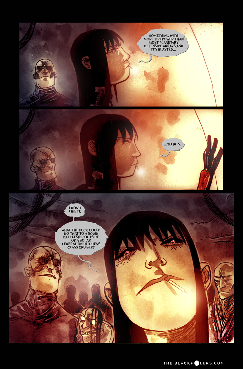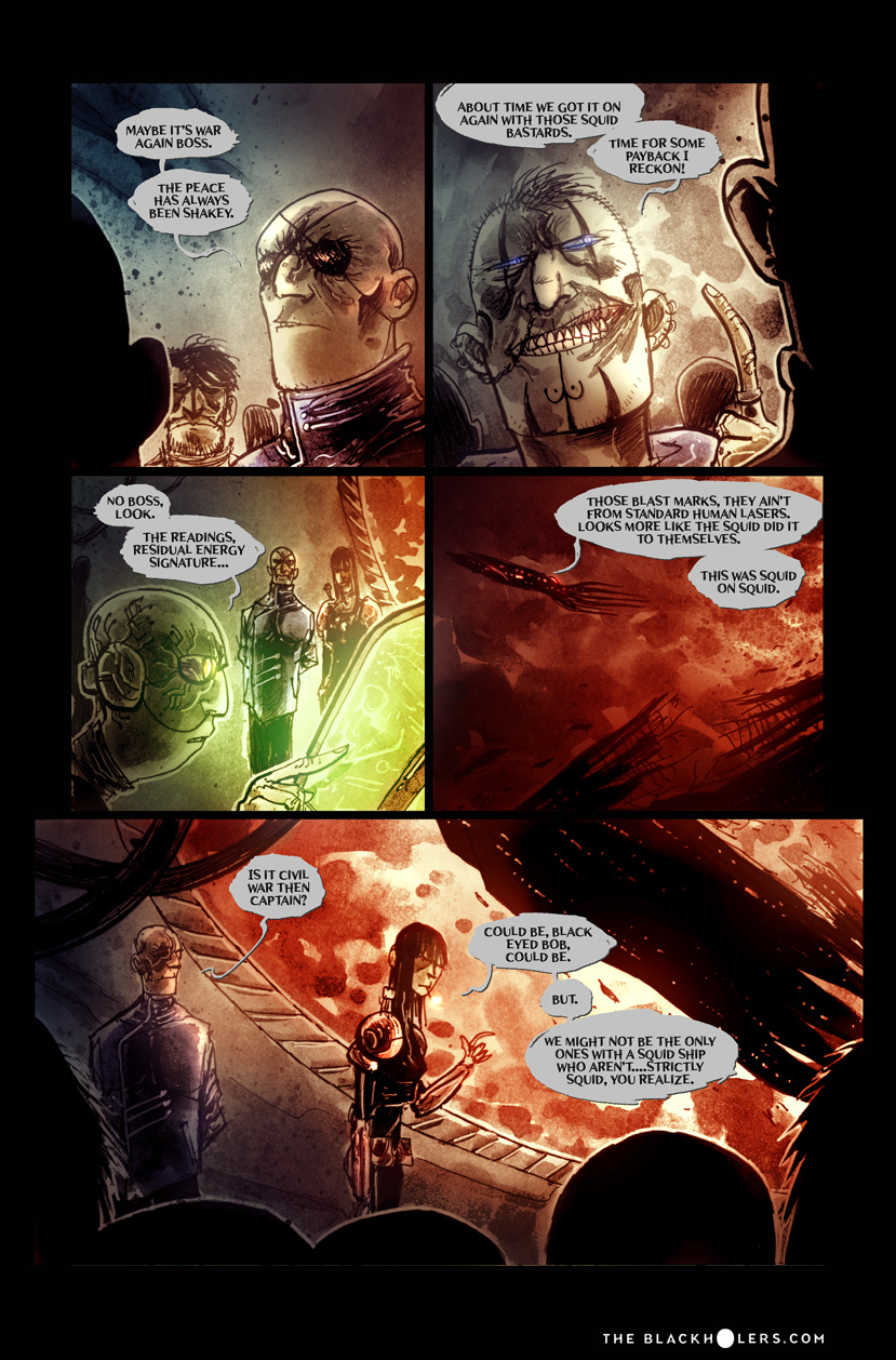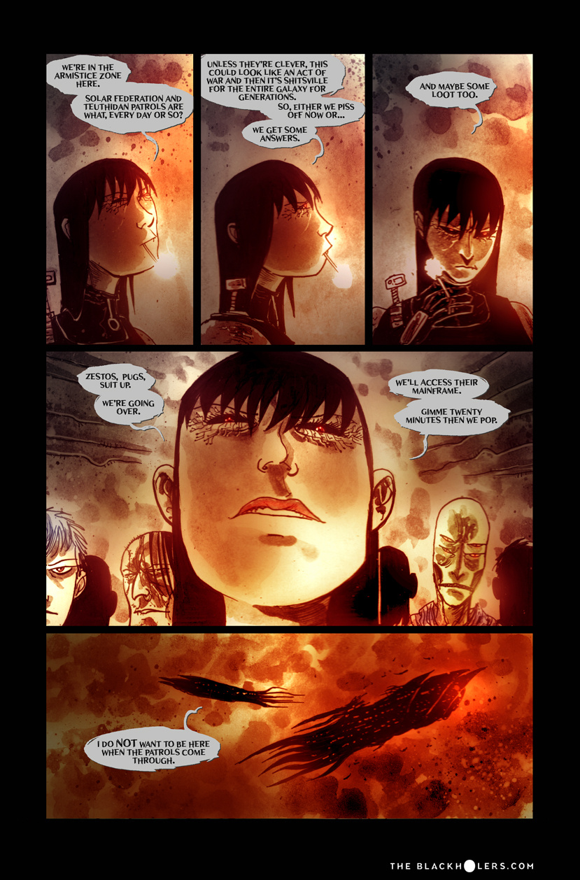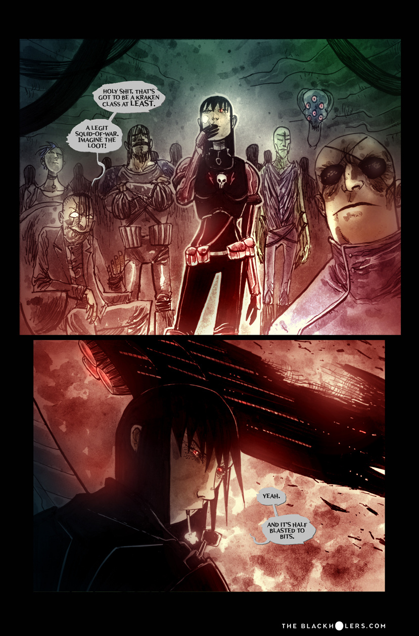 Furia, raised as a slave in the Teuthidian empire Drithium mines, tortured and blinded before she escapes, is on a quest for revenge against her former owners. Oh, and loot. Lots and lots of loot, as one of the most well known pirates or "Blackholers"as they're called, in the known galaxy. But war is brewing between old foes and Furia and her crew may have to put their lust for revenge on hold as they're caught up in a clash of empires and try to make a buck along the way.