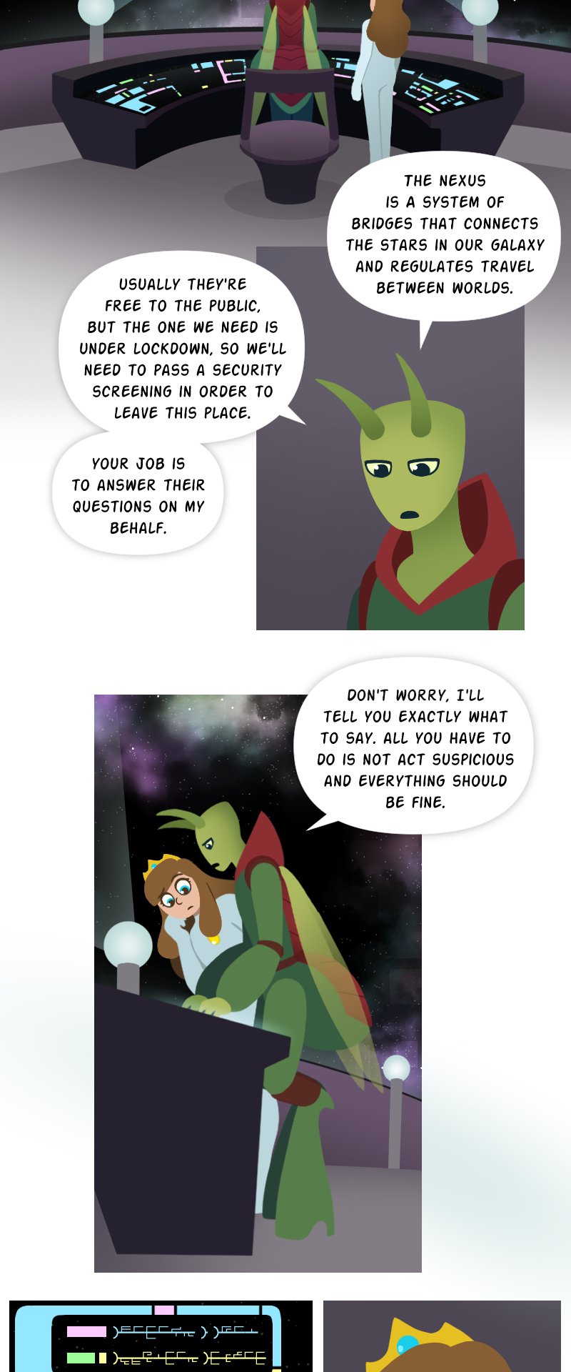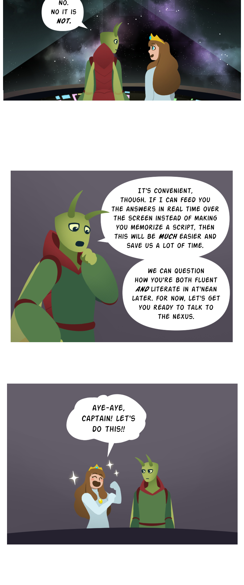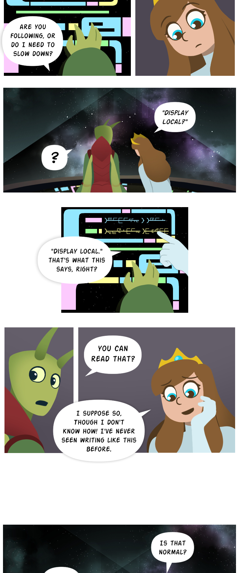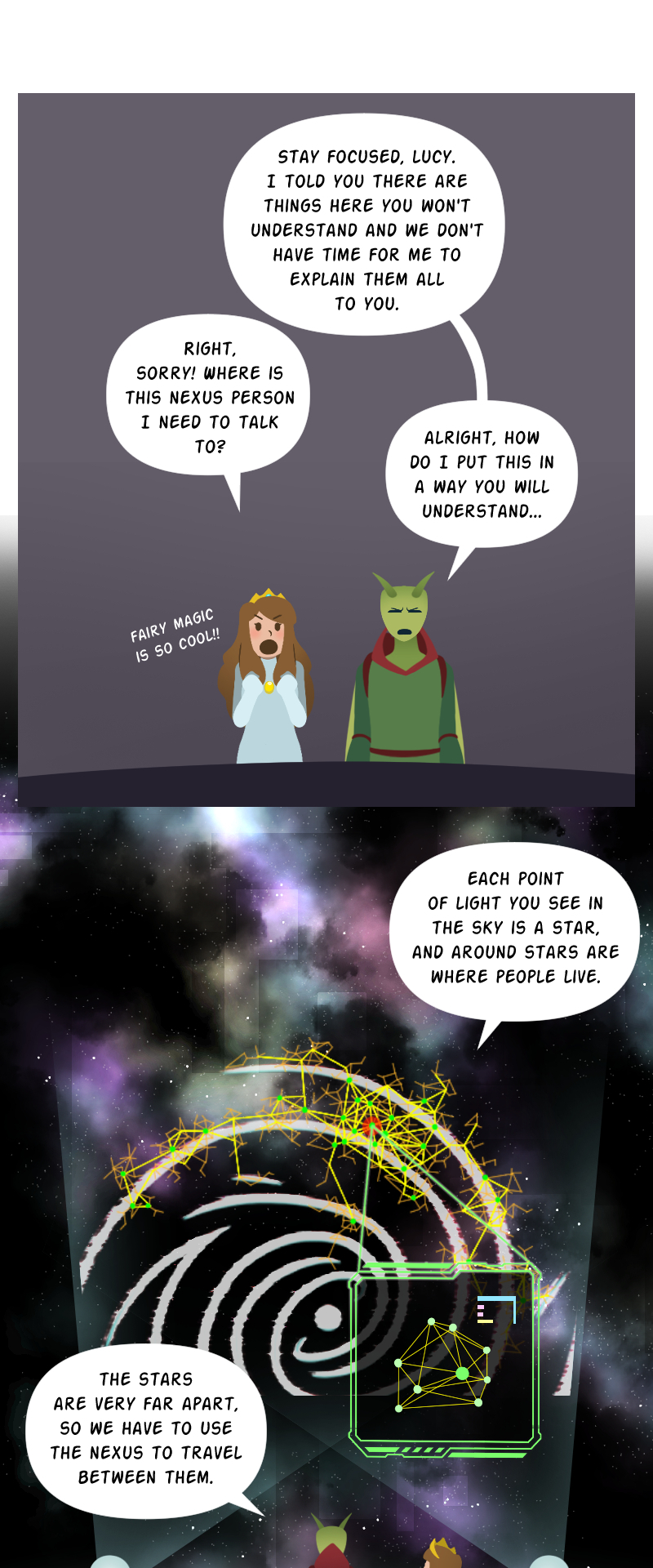 While waiting for her knight in shining armor to rescue her from a fire breathing dragon, Princess Lucy makes a poorly worded wish on a shooting star, and it takes her on a magical adventure to outer space! With help from the mysterious starstone, a fugitive alien prince, and many strange new friends, Lucy must navigate a whole galaxy to get back home, bringing a little bit of magic wherever she goes. [Updates weekly on Sundays!]