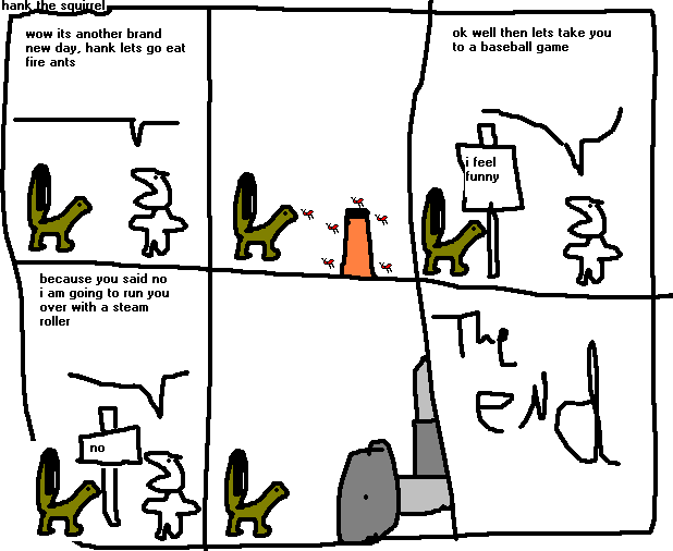 Hank The Squirrel is a web comic created in 1999 that nobody read. It's a copy+paste explosion of non sequitur humor and bad child-like art that may upset you. Thankfully you can be happy by not reading them which won't be your salvation as the coming global apocalypse shall render all that obsolete. But as Hank might write on his sign "I prefer to be optimistic."